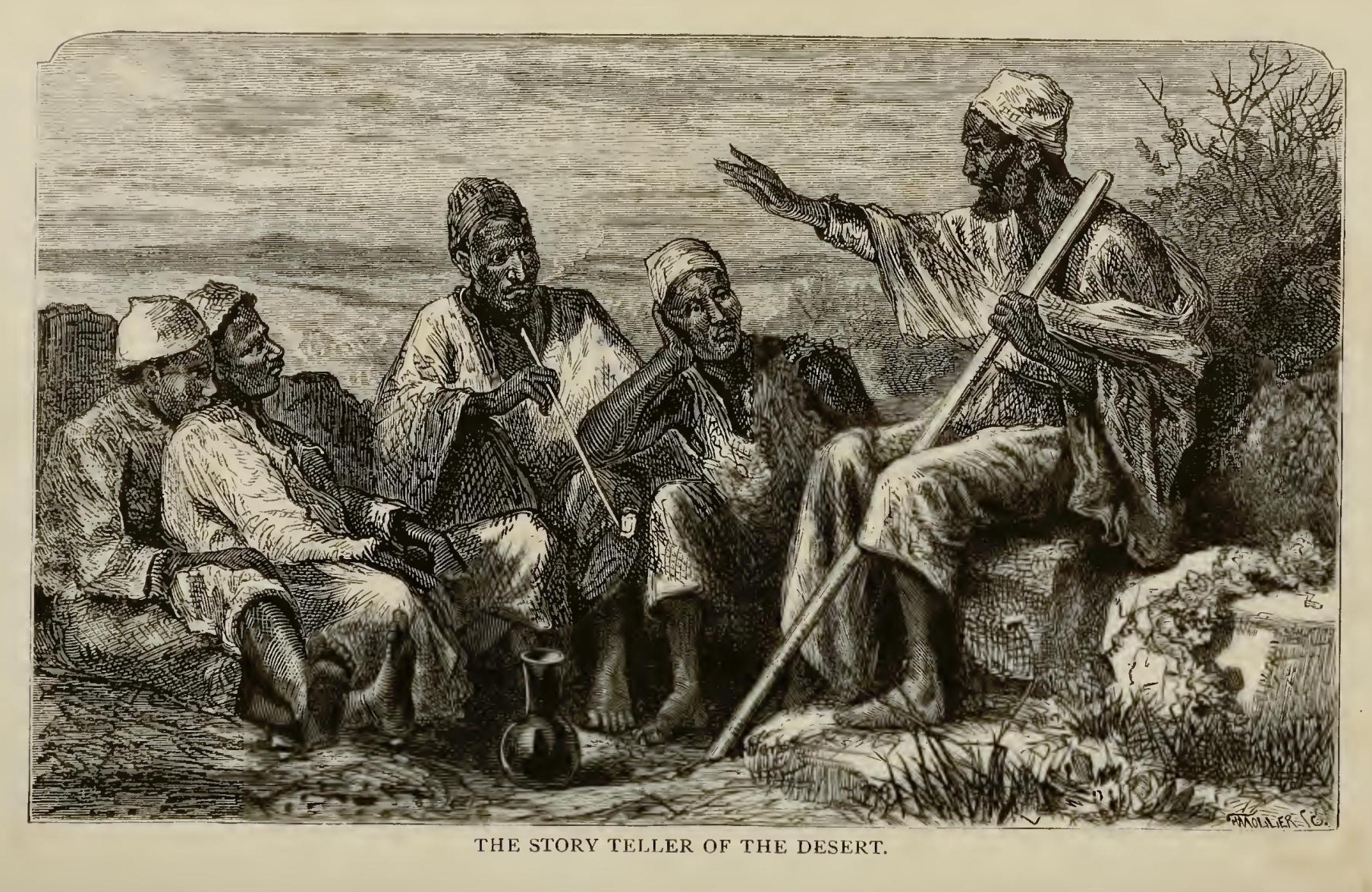 676A taste for story-telling is still one of their leading characteristics. They know no greater pleasure than to assemble together in their encampment, and seated in front of one of their number, smoke, and listen with the most intense interest to the exploits of warriors, the adventures of lovers, or the enchantment of sorcerers, until want of breath and want of sleep put an end to the tales.