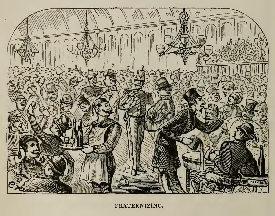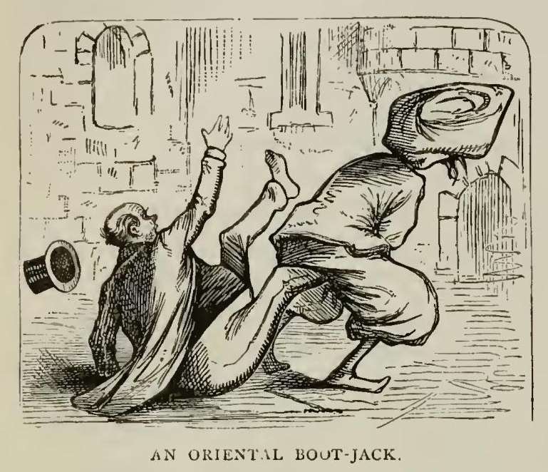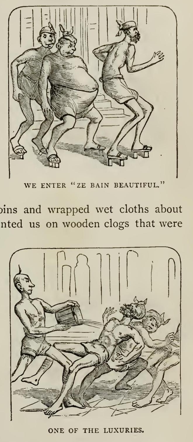 One of my acquaintances tells me of being pitched head foremost into six or eight inches of it after putting on his best clothes and starting out to make a call, which he indefinitely postponed and returned to his hotel, where he hung up to dry. He had the satisfaction—on the ground that misery loves company—of seeing, while on the way back from his mishap, a gaudily-dressed French woman undergo a similar tumble where the mud was deeper. Her feathers, and flounces, and laces, and general finery were sadly bedraggled, and when she emerged, with the aid of a couple of Arabs, she resembled a canary bird that has passed through a street-sweeping machine.