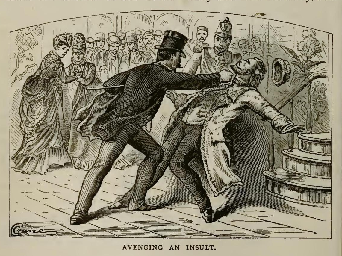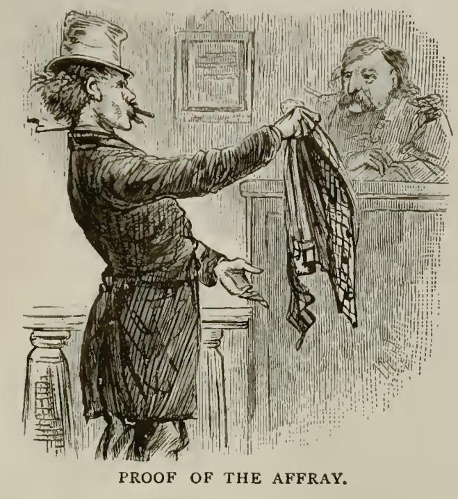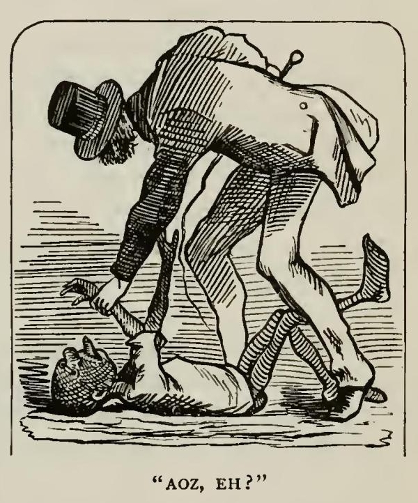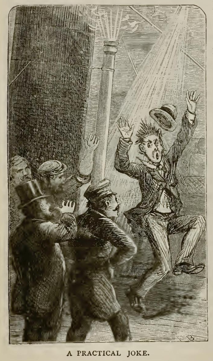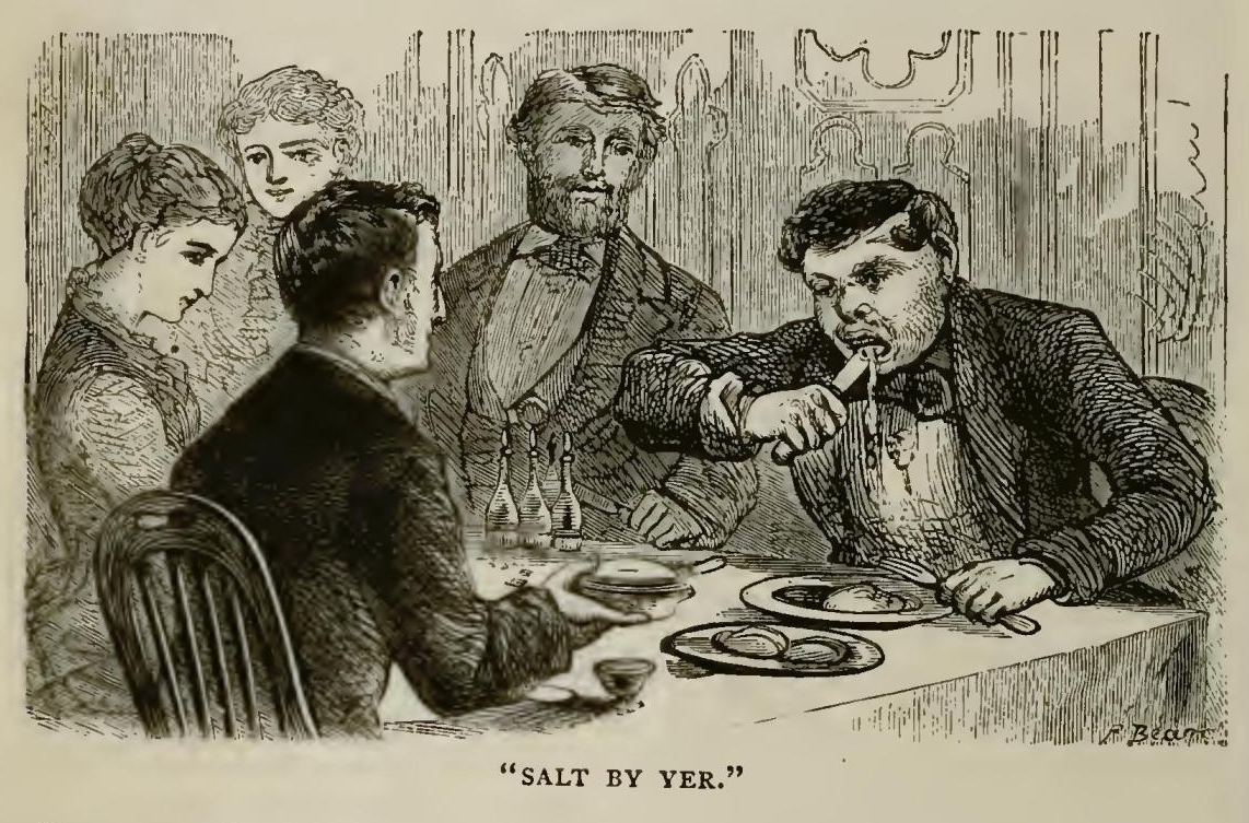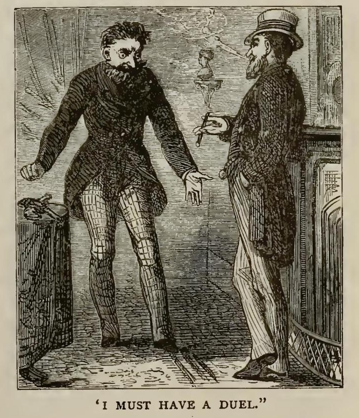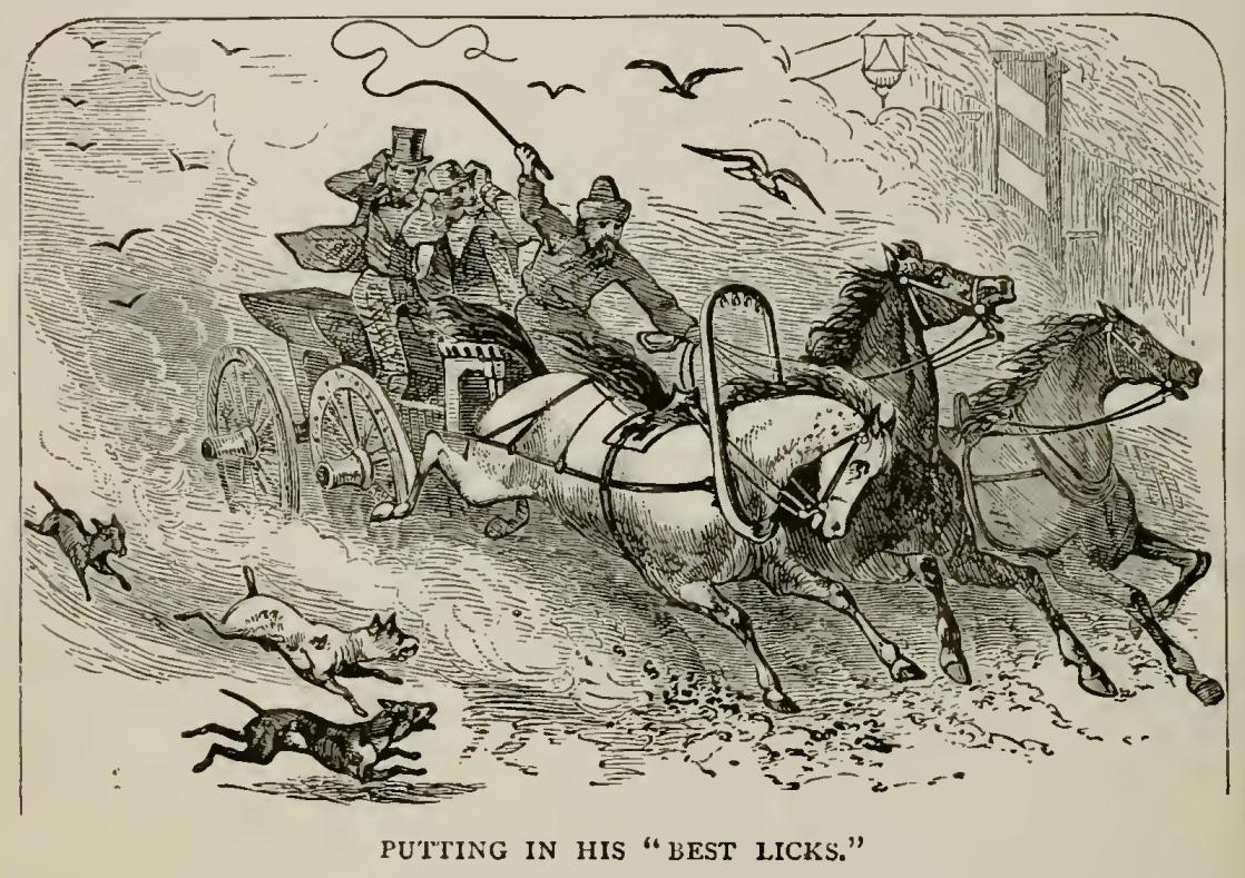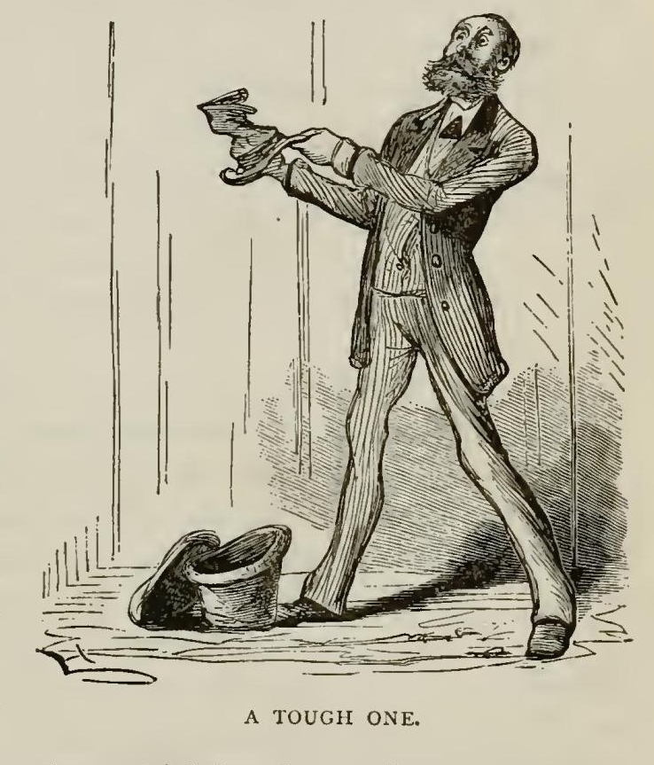 “The Grand Duke of Chicago; about fifty years old, lost his left ear in a duel, and wears three pairs of eye-glasses. Was decorated by the Prince of Hoboken five years ago, and always wears his decoration. You will know him by that—as large as a soup-plate and twice as greasy. When you see him, step up and say “Sing-Sing,” and he will understand you know all about him. Sing Sing is one of his palaces.”