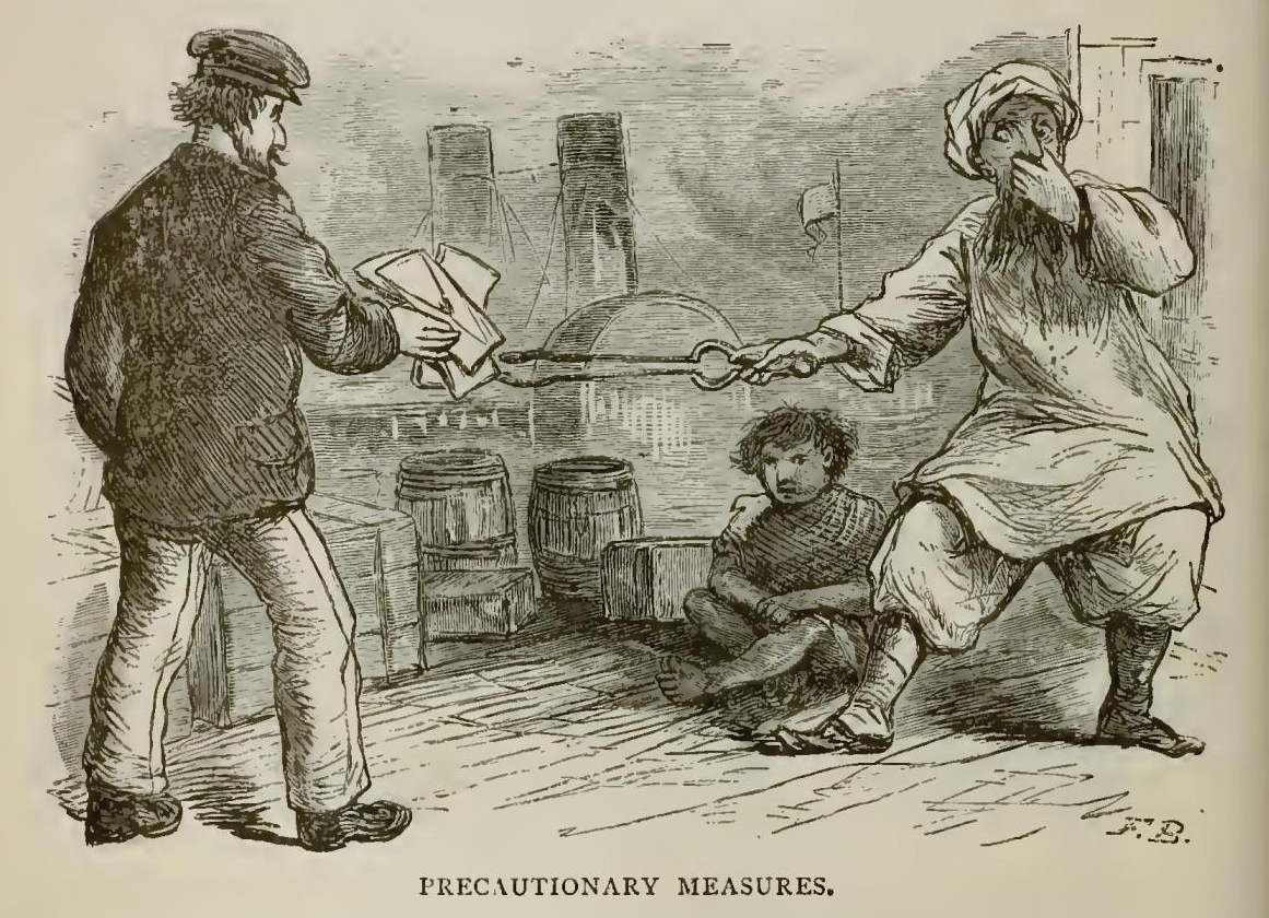 The boatmen were mostly Arabs and Maltese, strong, active fellows, whose rowing abilities are much better than their manners. There are no docks or wharves to the harbor; the ships must lie out and discharge their cargoes by means of lighters, and passengers must land and embark in small boats. The harbor is good without being excellent; the entrance is difficult and tortuous, and the sea frequently rolls in very uncomfortably. There is an outside harbor, where most of the foreign ships lie, as the inner one is rather shallow for them. The outer one is subject to winds and a heavy sea, but will be greatly improved when the new breakwater, now constructing, is finished. Hitherto the government has not cared to improve the entrance of the harbor, as a bad entrance is easier defended than a good one, but a better sentiment prevails at present, and the harbor is to be made as good as possible with a fair outlay of money.