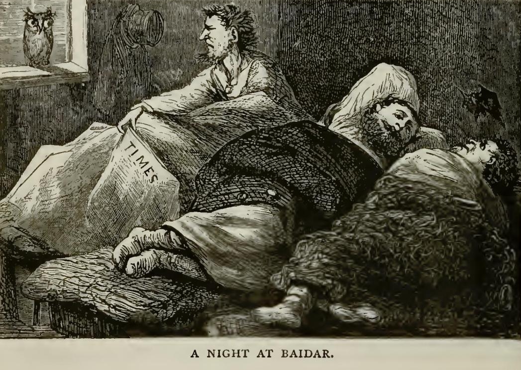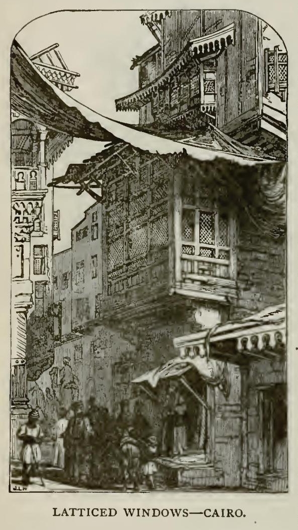 Well, early in April, though sometimes not till the middle or end of that month, there comes a wind from the south, a hot debilitating wind that makes you feel as stupid as a dead horse, and as cross as a bear whose ears and tail were cropped yesterday. The mercury goes above par in the shade, and is at a premium of twenty-five or thirty per cent, in the sun. Every drop of moisture has been wrung from the atmosphere in its passage over the desert, and the blast upon you feels like the breath of a furnace. Everything dries up—furniture cracks; the leaves fall from the trees; the hair crackles and emits sparks in combing; your newspaper will rustle and crack as though held over the flame of a lamp; the sheet of the letter you are writing will curl up, and before you are at the end of a word of three syllables, the first part of it will have the ink as dry as though baked in a kiln; and a wet cloth hung at the window dries up almost instantaneously. If you are in the house, you think you will walk out, and if you walk out you will wish you had staid in. It is time for you to settle your hotel bill, and get away from Cairo.
