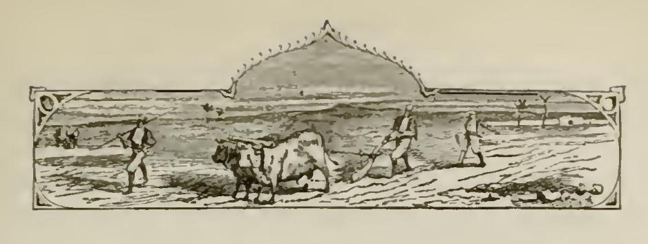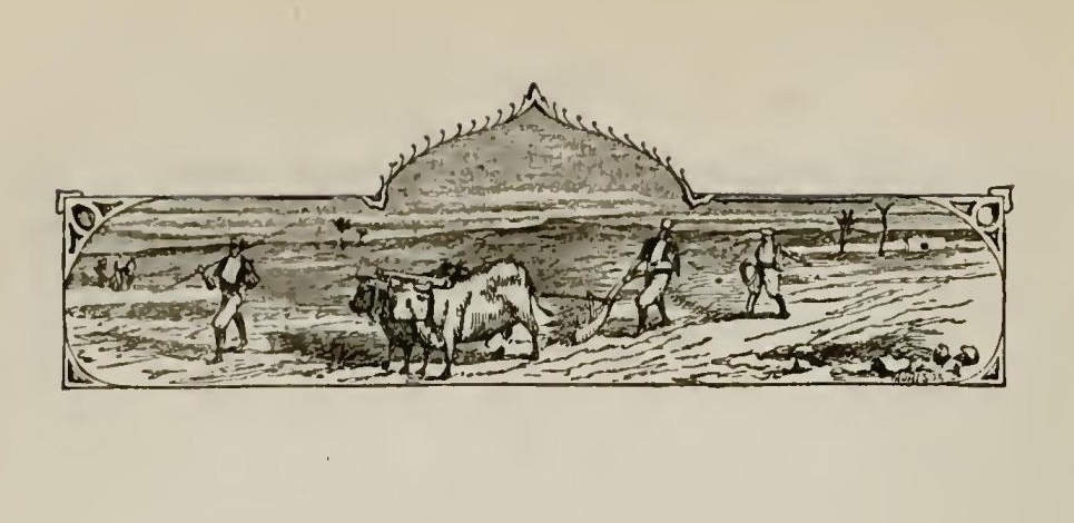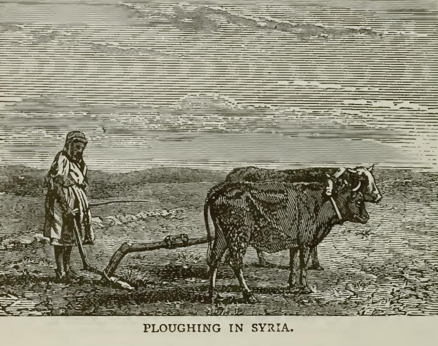 The Desert soon disappeared, and we rode through the flat plain, carpeted with the richest of verdure, and furrowed here and there with great and small and medium canals. In some fields the crops appeared half grown; in others they were just beginning, and in others the plows—rude implements which the most careless farmer in America would disdain—were at work. 684The plow of Egypt is the same in appearance, and it may be the same identically, that was in use before the Pyramids were built, and before the foundation of Thebes, with her hundred gates. It is a billet of wood, pointed at the forward end, and furnished with a beam and an upright, the latter serving as a handle. A pair of oxen, or buffaloes, are the propelling power, and the yoke that fastens them together is a straight stick held in place by ropes or wooden pins.