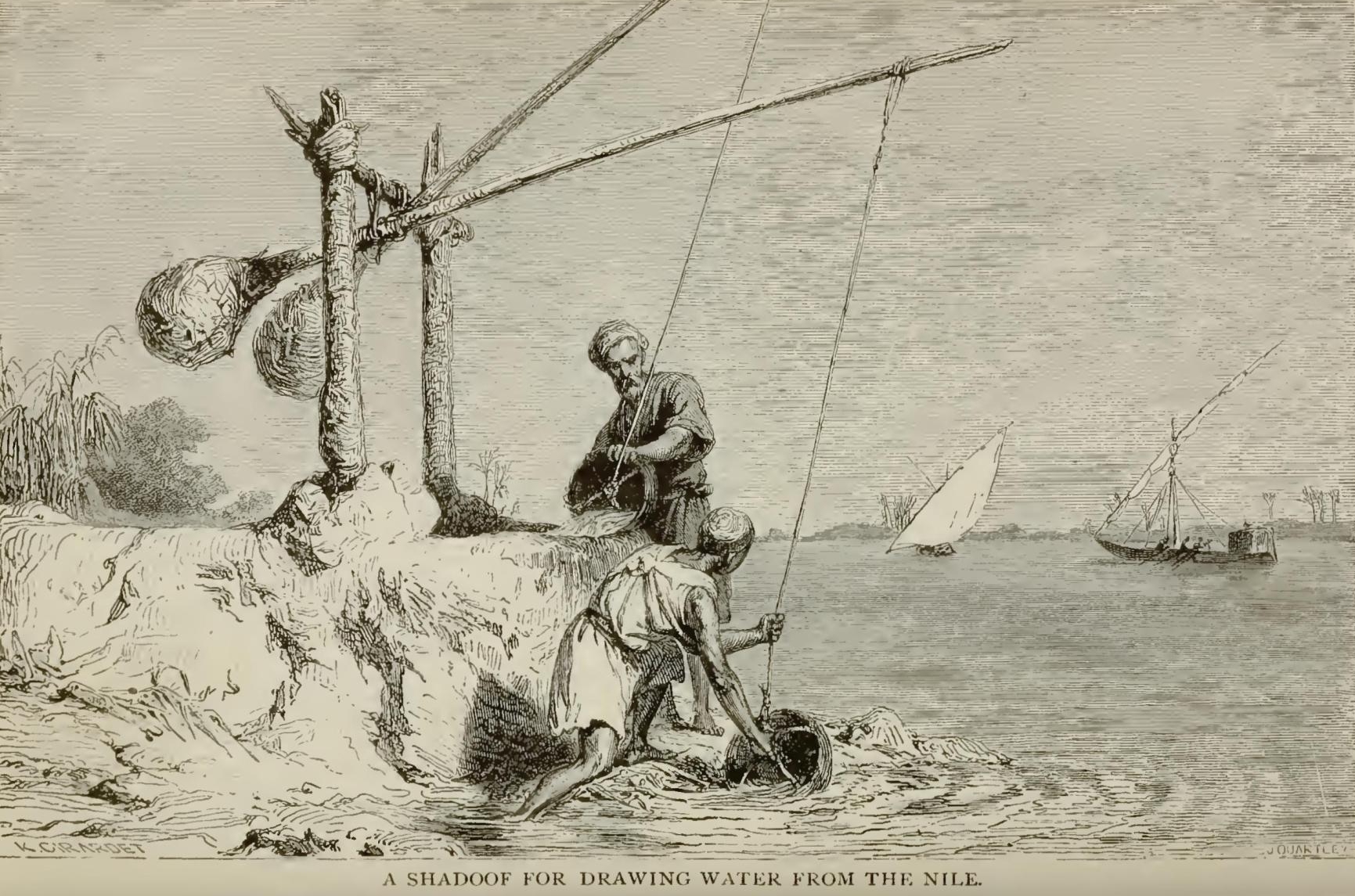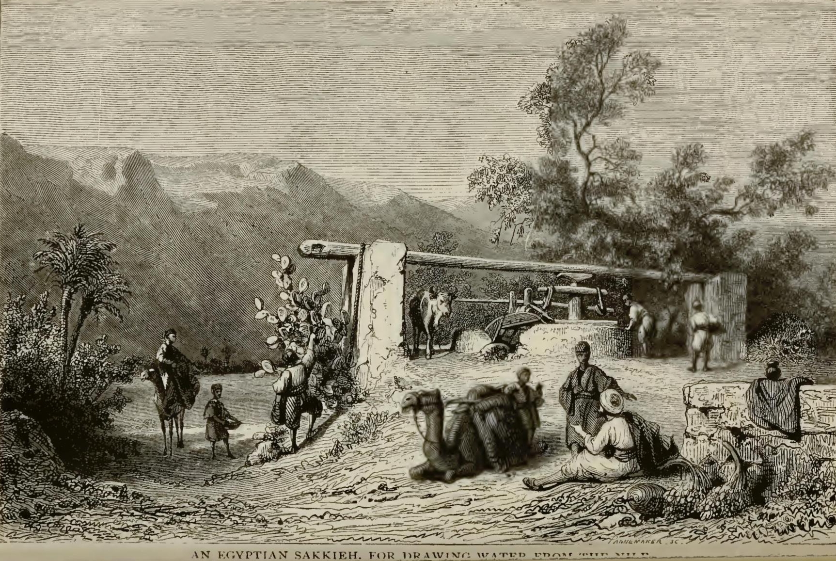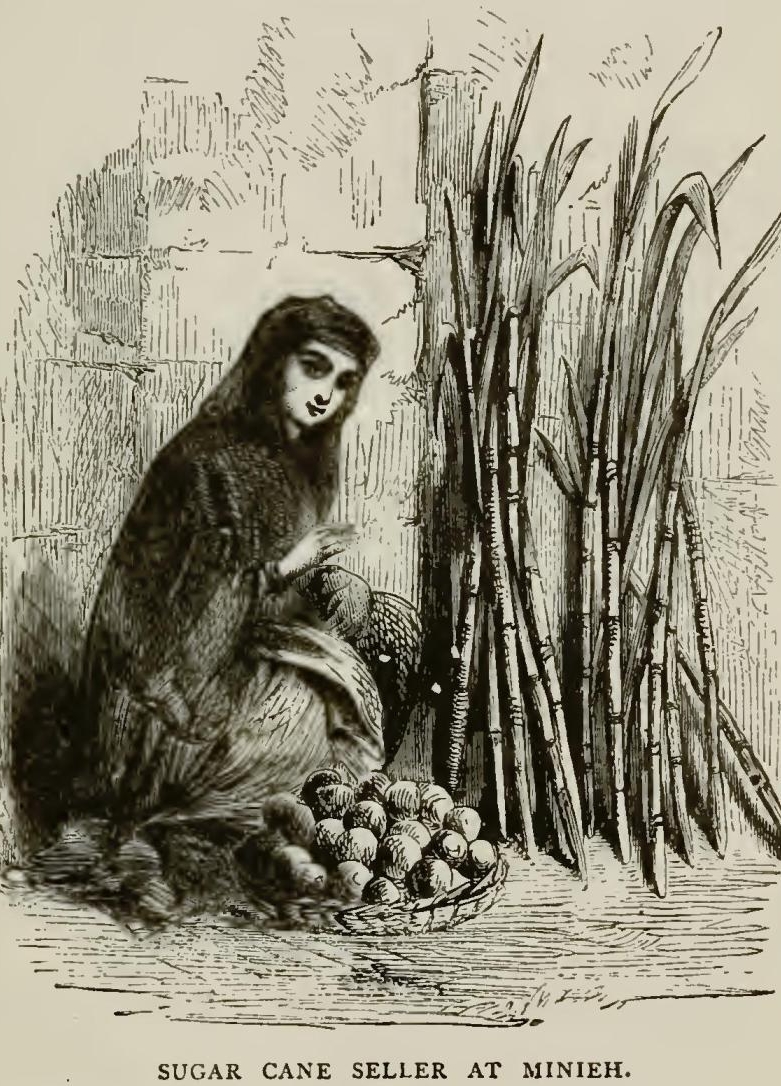 Numerous sakkiehs, turned by oxen or buffaloes, were at work, and in nearly every instance the animals were blindfolded with pads of coarse straw-work over their eyes. Frequently we passed villages with mud walls, and with the general aspect of uncleanliness and discomfort that I had observed in upper Egypt, and that one observes in nearly all the native villages.