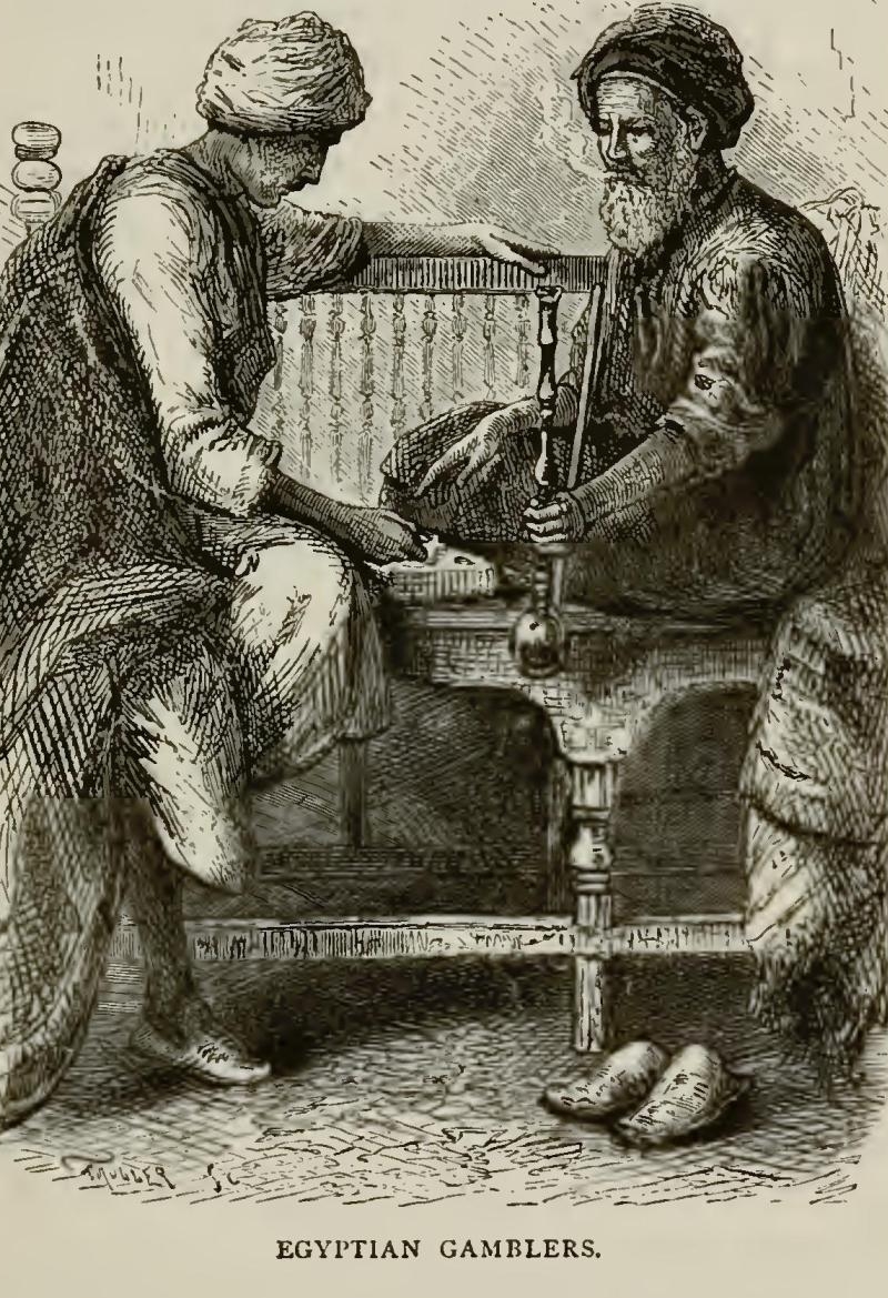January, April, and August, are the months for these festivals, each of which lasts eight days, and brings together sometimes as many as two hundred thousand people. Ostensibly they come to pray at the tomb of a celebrated saint of Islam, none other than Seayyid-Ahmed el-Bedawee, a sort of Moslem Big Indian, who flourished about seven hundred years ago, and was buried at Tantah. The pilgrims recite a few prayers at his tomb, and then attend to fun and business. A large trade is carried on in horses, camels, and other merchandise, and formerly there was an extensive commerce in slaves. The sound of Oriental music was borne to our ears, and we strolled through row after row of tents or booths occupied as cafés, and the resort of singing and dancing girls, jugglers, story-tellers, and performers of all kinds.