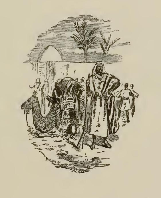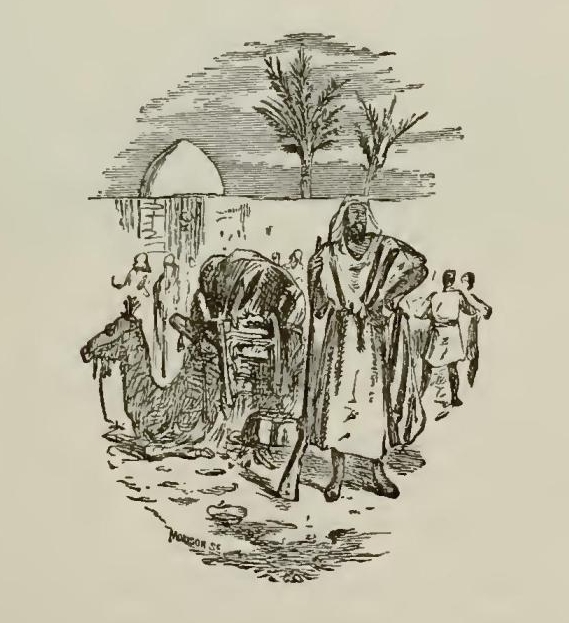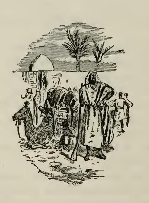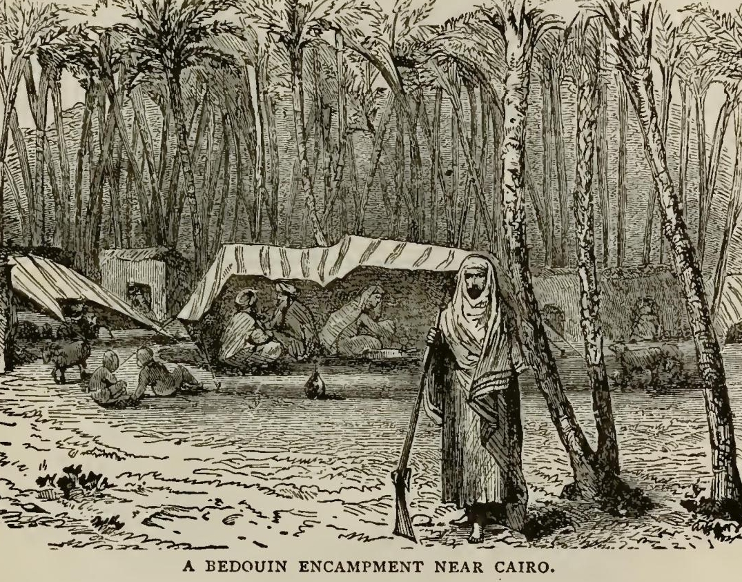 The real Bedouin visits the city only to make purchases at the bazaars, and he is the most picturesque of all the moving figures in an Eastern crowd. Strong, but slender in frame, his striped abba hangs easily in heavy folds over his shoulder, and his dark skin and prominent features, and keen black eye, all mark the unchanged son of the desert, who belongs not to the city, but passes through it, indifferent to its conveniences and luxuries, and despising its customs like his ancestors. In my journey up the Nile I saw many encampments of genuine Bedouins, and I always found that an Arab in his encampment is a different being from what he is when wandering in the desert. Within the former his time is idly passed, smoking, drinking coffee, and sleeping; yet his steed was always ready caparisoned at the door of his tent; beside him in the sand was planted his spear, and at the call of his chief he was ready to vault into his saddle, and rush forth to battle with all the fire of his nation.