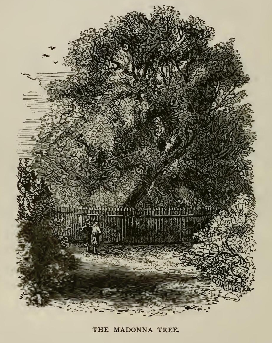 677Hard by there is an old sycamore tree—called the Madonna’s tree—under which, tradition says, Mary rested with her infant when flying from Herod. It looks like a stunted tree of enormous growth, as if several trees springing up side by side had grown together. That the tree as it now stands is of very great age, there can be no manner of doubt.