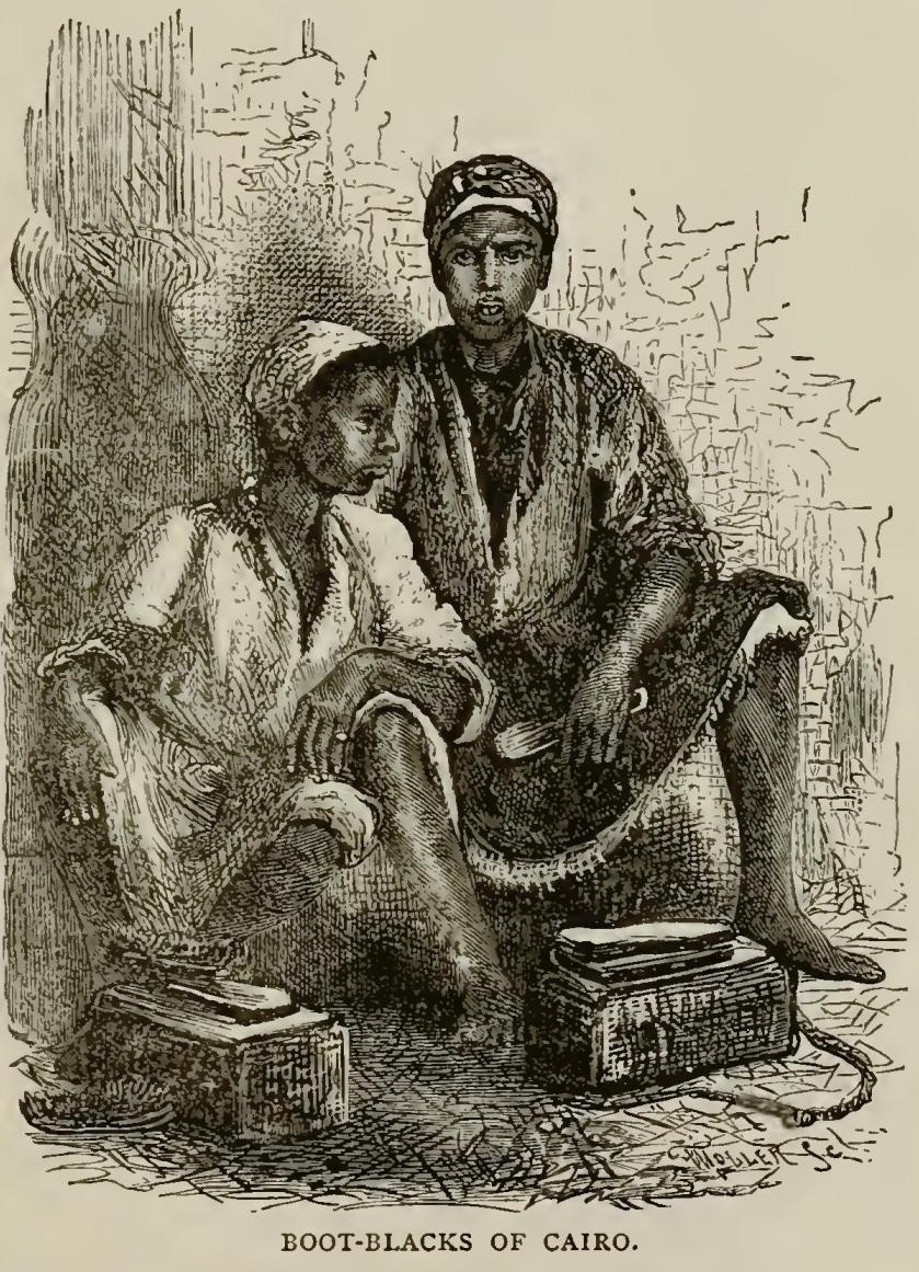 I took a farewell stroll around the Mooskee, the Esbekeeah, and the Shoobra road and skirmished for the last time with the donkey boys and dragomen who infest those places. Among the tribes of ragged, dirty, vagrant urchins who swarm in the streets of Cairo, the donkey boys head the list. Every traveller knows them and you hear them spoken of as “Confounded rascals” or “Bright little fellows” according to the luck the Frankish traveller has happened to meet among the species. Occasionally you see boot-blacks with kits similar to their cousins in more civilized countries, and the two who used to hang around my hotel in Cairo always ready for “backsheesh” whether they gave my boots a “shine” or not, were the most unprepossessing little gamins I ever met.