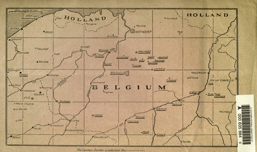Diary of Eitel Anders, a German soldier.—"We crossed the Belgian frontier on August 15th, 1914, at 11.50 in the forenoon, and then we went steadily along the main road till we got into Belgium. Hardly were we there when we had a horrible sight. Houses were burnt down.... Not one of the hundreds of houses were spared. Everything was plundered and burnt."