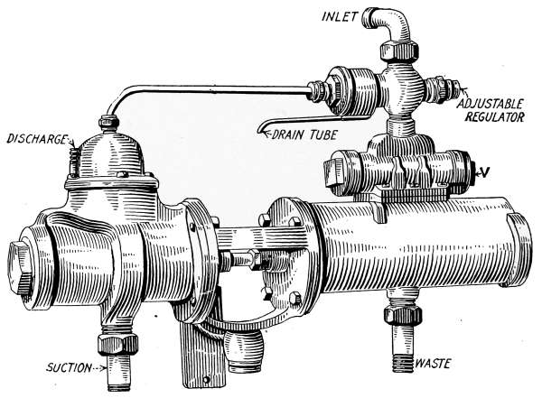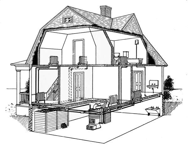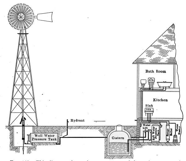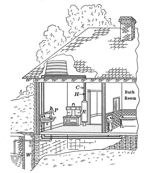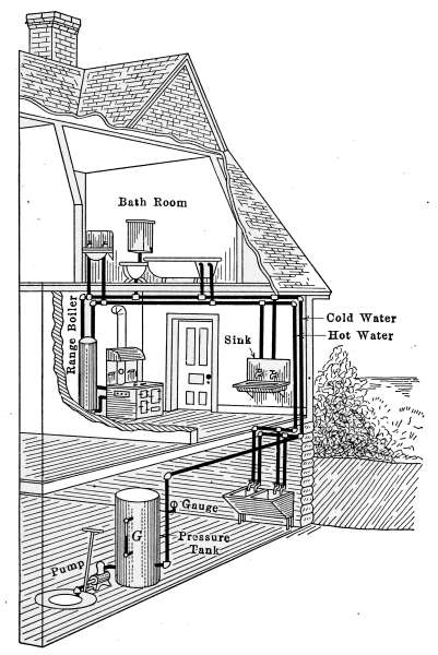 The systems available for household water distribution take advantage of natural laws, which aided by suitable mechanical devices and conveniently arranged systems of pipes, provide water-supply plants to satisfy any condition of service. They may be of simple form, to suit a cottage, or elaborated to the requirements of large residences and made entirely automatic in[vi] action. In each, the apparatus consists of parts that perform definite functions. The parts may be obtained from different makers and assembled as a working unit or the plant may be purchased complete as some special system of water supply. An acquaintance with domestic water supply apparatus may be of service in every condition of life.