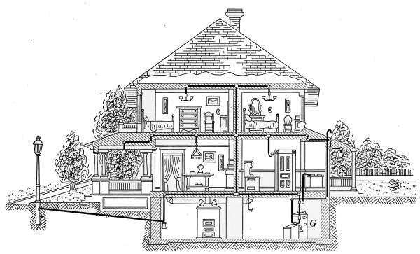 Attention is called to the value of observing houses in process of construction and the means employed for the placement of the pipes for the sewer, gas, water, electric conduits, etc. These are generally located by direction of the specifications provided by the architect but observation of their installation is necessary for a comprehension of actual working conditions. It is suggested that the work be made that of, first, acquiring an idea of established practice, and second, that of investigating the examples of its application.