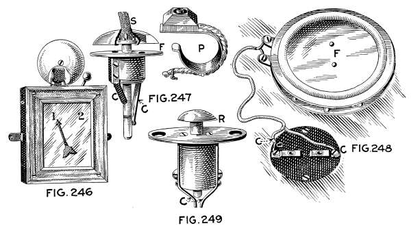 Fig. 266 is placed in the door frame in such position that electric contact is made by release of the projecting pin as the door is opened. When the door is closed, the pin is depressed and the light is extinguished