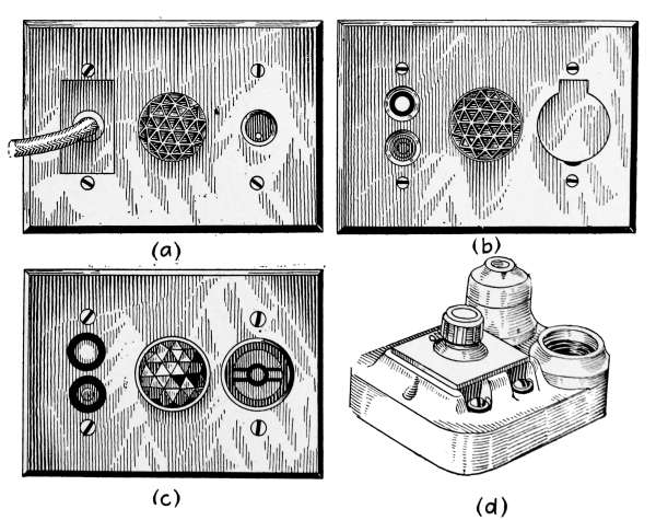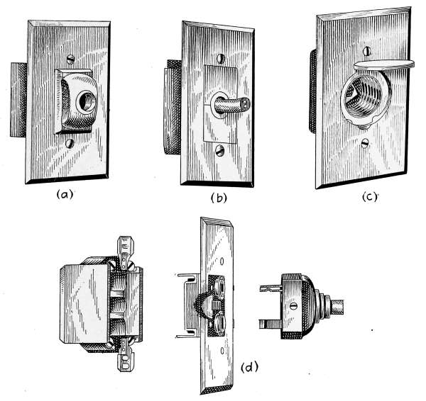 Fig. 267,c is of the screw-plug type with beveled-edge brass cover plate finished to match surrounding hardware. By many[380] this is preferred for apartment use as it will receive any style of Edison attachment plug.