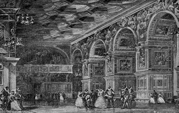 The sound of the King's cane is audible, striking heavily on the floor as he strides up and down the room. The door of his bedchamber opens; Charlotte de Bavière, crimson in the face, appears. She calls her people together, and hastily departs, followed by the wondering glances of the courtiers, standing in groups about the Œil de Bœuf.