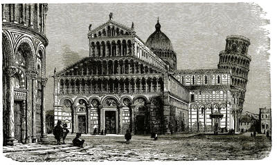 As the dying day begins to wrap herself in the sombre folds of evening, we find ourselves in Pisa, a quiet little town of 26,000 inhabitants, beautifully situated on both banks of the Arno, six miles from the sea. The night comes and goes. Next morning I am standing on the top of Pisa’s “Leaning Tower,” in time to see the sun rise. This tower is one of the wonders, not of the ancient, but modern world. It is some thirty-three feet in diameter and one hundred and eighty feet in height, and leans thirteen feet out of the perpendicular. This oblique or leaning position gives it a very peculiar appearance. It looks as if it were falling; you expect every moment to see it dashed to pieces against the ground. But it has been in this position some 650 years, and, if we may argue from the past, many moons will wax and wane before it strikes the ground. No one knows whether the original design was to build a leaning tower, or whether in the course of construction one side of the foundation gave way, and thus left the tower in an oblique position. It was by dropping balls from the summit of this tower that Galileo verified his theories regarding the laws of gravitation. It was the swaying of the bronze lamp which still hangs in the cathedral at the foot of this tower that first suggested to Galileo the idea of a pendulum.