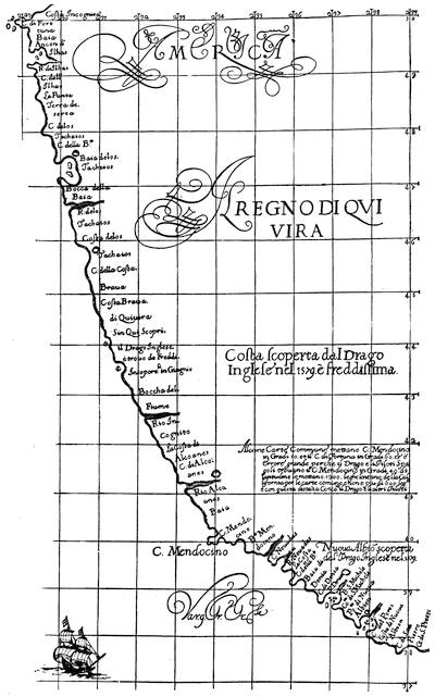 [1608] This might have been inferred from Pigafetta’s map of the strait, in which the western shore of Patagonia and Chili are well laid in; but that inference seems to have escaped the globe-makers.