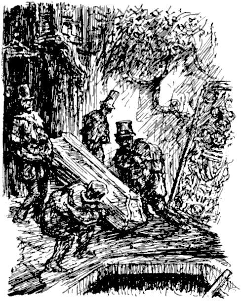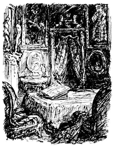 Ein paar Ottomanen und goldene orientalische Kandelaber waren im Raum verteilt. Und da stand auch das Lager, das Brautbett! Es war nach einem indischen Modell gearbeitet; es war niedrig und aus massivem Ebenholz geschnitzt und von einem Baldachin, der einem Bahrtuch glich, überdacht. In jeder Ecke des Zimmers stand aufrecht ein riesiger, schwarzgranitener Sarkophag, den unsterbliche Skulpturen schmückten. Diese Sarkophage stammten aus den Königsgräbern von Luxor. Aber noch mehr als in allem andern waltete meine unheimliche Phantasie in der Wandverkleidung des Gemachs. Die unverhältnismäßig hohen Wände waren von der Decke bis zum Fußboden mit faltenreichem schwerem Goldstoff verhangen — demselben Stoff, der als Fuß- und Ottomanenteppich, als Bettdecke und Baldachin sowie als prunkhafter Überhang der einen Teil des Fensters überschattenden Vorhänge Verwendung gefunden hatte. Dieser Goldstoff trug in unregelmäßigen Zwischenräumen arabeskenartige Figuren von einem Fuß Durchmesser, die aus tiefschwarzem Stoff gearbeitet waren. Aber nur von einer einzigen Stelle aus betrachtet schienen diese Figuren nichts als Arabesken zu sein. Infolge eines heute allgemein bekannten Verfahrens, das man jedoch schon im frühen Altertum anwendete, boten sie dem Beschauer von jeder Seite ein andres Bild. Wenn man das Zimmer betrat, erschienen sie einfach nur wie Monstrositäten, je mehr man sich ihnen aber näherte, desto bestimmtere Gestalt nahmen sie an, und Schritt für Schritt, je nach dem vom Beschauer gewählten Standpunkt, sah man sich von einer wechselnden Prozession gespensterhafter Wesen umringt, wie etwa der Aberglaube der Normannen sie ersonnen hat oder ein Mönch in sündenhaftem Traum sie erschauen mag. Der gespenstische Eindruck wurde noch erhöht durch einen künstlich hinter die Draperien geführten ununterbrochenen Luftzug, der dem Ganzen eine rastlose und abscheuliche Lebendigkeit verlieh.