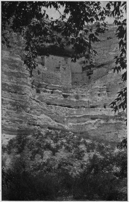 Today the valley of the Verde maintains but a sparse population. Here and there is a white man’s hamlet; here and there are wickiups of the now peaceable Apaches; and where, between the cliffs that wall in much of the valley, there is level land enough to make farming operations possible, there are scattering ranches strung along. Time was, however, when the valley was the home of an abounding aboriginal population. How long ago that was no one knows, further than that it was before—and probably long before—the 16th century Spaniards discovered the Upper Verde and reported silver 164 outcroppings there. The bordering cliffs and hilltops are dotted and honeycombed with the ruins of pueblos, stone fortresses and cave dwellings to an extent that has made the region unusually attractive to the archaeologists. Two of these prehistoric remains on Beaver Creek hold especial interest also for the lay traveler. They are the so-called Casa Montezuma, or Montezuma’s Castle, and Montezuma’s Well. The former, a strikingly fine example of a cliff ruin as imposing in its way as a castle on the Rhine, has been made a National Monument and is under such protection of the United States government as goes with a printed notice tacked upon a tree nearby, for there is no resident guardian. The Well is upon a private ranch 8 miles north of the Castle. It need hardly be said that Montezuma, whose name is popularly joined to both, had nothing whatever to do with either; nor indeed had any Aztec, though people who get their ancient history from newspapers, will tell you that the ruins are of Aztec construction. Both Castle and Well are close to the Arizona State Highway, and may be 165 reached by a 50 or 60 mile drive from Flagstaff, or half that from Jerome. Another way to reach them is from Prescott by automobile livery. Yet another is by rail from Prescott to Cherry Creek (Dewey Postoffice) on the Crown King branch of the Santa Fe, and then by auto-stage through the picturesque Cherry Creek Cañon 32 miles to Campe Verde on the Verde River. Campe Verde was formerly an army post of importance during the Apache wars, but is now peaceful enough for the most pacific, maintaining a hotel, a garage, a barber shop, an ice-cream and soda-pop saloon, a store or two, and similar amenities of 20th century living as delightful as unexpected in this out-of-the-way corner of our country.