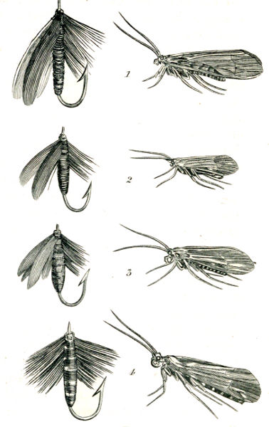 With respect to the fly, as it usually touches the stream by a very small surface, that of the air-bubbles on the fringes on its legs, it can scarcely affect the water so as to give it any 40power of communicating smell. And as you have seen a ripple or motion on the water is necessary to deceive fishes; and as they look at the fly from below, they see distinctly only the legs and body, which, when the colours are like those of the natural fly, may easily deceive them; the wings, which are the worst imitated parts of the artificial fly, seldom appear to them, except through the different refractive power of the moving water and the atmosphere, and when immersed, they form masses not unlike the wings of a drowned fly, or one wetted in rising.