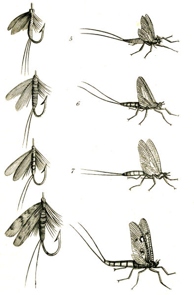 Hal.—You are right; for fancy is always something: and when we believe that we can do things better in a particular way, we really do, by the influence of imagination, perform them both better and with less effort. I agree with moralists, that the standard of virtue should be placed higher than any one can reach; for in trying to rise, man will attain a more excellent state of being than if no effort were 33made. But to our business. As far as the perfection of the material for the angler is concerned, the flies you find on this table are as good as can be made, and for this season of the year, there is no great variety on this river. We have had lately some warm days, and though it is but the 18th of May, yet I know the May-fly has been out for three or four days, and this is the best period of this destructive season for the fisherman. There are, I observe, many male flies on the high trees, and some females on the alders.