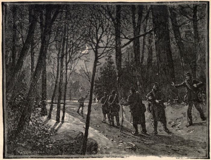 As we became deeply interested in our talk the time passed quickly. The tall forest-trees cast long shadows over us. The sun was disappearing in the west. The sky was cloudless. Our preparations for the third night of travel were complete. Soon after dusk we emerged from our hiding place, and in due time were upon the road. Our rest during the day had been refreshing, and we walked briskly forward. We passed one house early in the night. It was too early, we thought, to try our plan for procuring food, and the appearance of the house and its surroundings did not justify the belief that the occupants had any food to spare. So we passed on. Near ten o'clock we came to another house on our left. It was near the road, not more than twenty yards distant. From appearances all inside were asleep. At least no light was visible, and silence reigned. At most of[29] the houses we had passed, the dogs had barked at us. It was not so at this one. We went a few yards beyond the house and halted in the road. Five of us were to lie in wait, while the sixth went forth on the errand of necessity. Which one of us should go upon the errand was a question for decision. It was decided by drawing cuts. Taylor was chosen to attempt the experiment. Taylor's overcoat was of a light-gray color, and had once belonged to a Confederate soldier. Smith's cap was also of "secesh" antecedents. Taylor donned them both, and was to play the Confederate soldier on furlough. He was to go to the front door of the house and knock. When the door was opened to him, if he was asked to come in he was to decline on the pretext of not having time. He was then to apply for something to eat, enough for himself and two comrades a supper that night and breakfast the next morning, which would suffice for one meal for our party. He was to insist on immediate compliance to the request on the plea that he and his comrades were hungry and obliged to march all night. If asked why so? he was to answer that they had been home on furlough, that their time was nearly out, and that they must report to the company by a certain time—we had anticipated many questions that we judged would be asked, and had answers to suit.