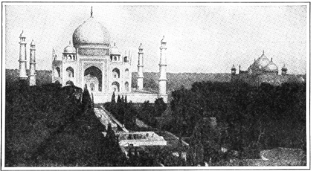 Few if any buildings in the world have been the subject of such praise as that bestowed upon the Taj Mahal ("Gem of Buildings"). Travelers,[2] painters, authors, and poets have all sought to express in word or color the indefinable charm of this gem of Indian art. Built at Agra, in India, by the great mogul of Delhi, Shah Jahan, as a tomb for his favorite wife, Mumtaz Mahal, the Taj is a veritable translation into stone of human remembrance and affection. It was begun in 1632, and was completed in twenty-two years. The material of which it is built is pure white marble, and inlaid in its walls are jaspers, agates, and other stones in marvelous designs. But it is perhaps the dome that gives the greatest beauty to this tomb. Of typical Eastern shape, it rises a mass of white against the deep blue of the Indian sky, or shines like silver in the radiance of the Indian moon.