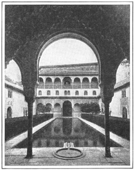 As is the case with almost every Mohammedan building, its exterior is extremely plain. But once the door is passed one seems to have stepped from Europe to the Orient. Courtyards and porticos, halls and passages, open before the visitor in a truly oriental maze of color and decoration. The first important court is known as that of the Myrtles. In its center is a marble basin a hundred and thirty feet long, bordered with trees of myrtle and orange, and flanked at both ends by two-storied pavilions with slender marble shafts[4] and graceful Moorish arches. From one of these pavilions opens the Hall of the Ambassadors, the throne room of the califs, and the largest chamber in the palace.