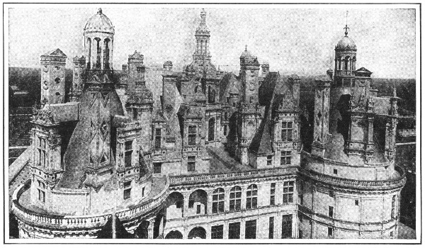 Four hundred feet square along its outer walls, this vast château was designed by Francis I merely as a hunting seat. The chief exterior attraction of the building lies in its roof. This is a very maze of gables, dormers, chimneys, and cupolas, dominated by the lantern that crowns the center stair, and in which lights were hung to guide belated hunters from the forest.