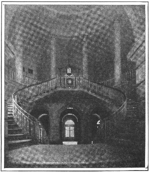 This stairway is the chief attraction of the interior. Sweeping round a central newel which forms an open well, it rises the full height of the building. Moreover, it is not a single flight of steps, but two, so placed that one person may go up and one come down, yet never meet. From this stairway four large halls open at every floor, and four hundred and forty rooms and fifty other stairs fill up the wings of this great palace. The interior, when richly furnished, must have been magnificent.
