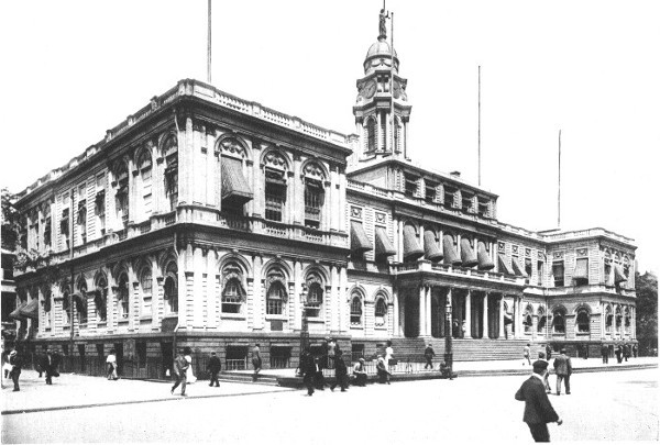 One room of the City Hall was set aside for the State governor's use; and it has lately been restored to the original condition. Many excellent portraits hang on the walls. The furniture of the Governor's Room was largely taken from Federal Hall, where Washington was inaugurated and the city government was located before the building of the City Hall. Federal Hall has unfortunately been destroyed. It stood at the corner of Wall and Nassau Streets, and was built with stone from the wall that gave Wall Street its name.