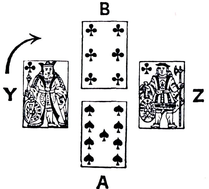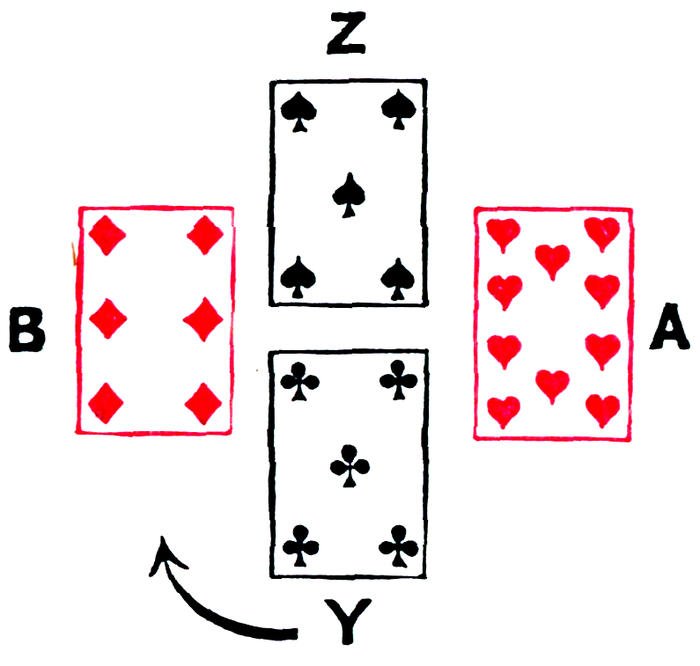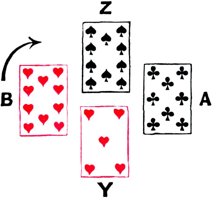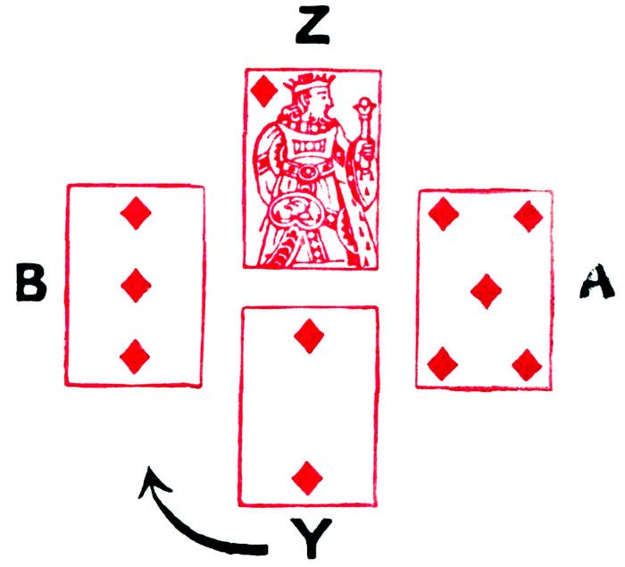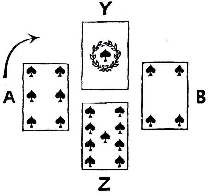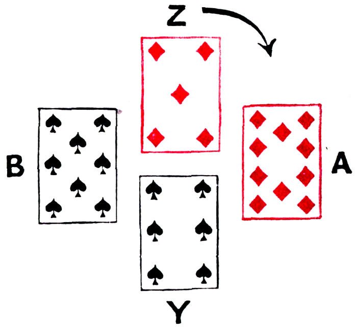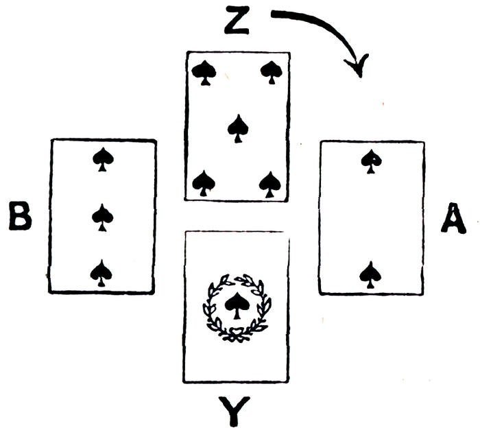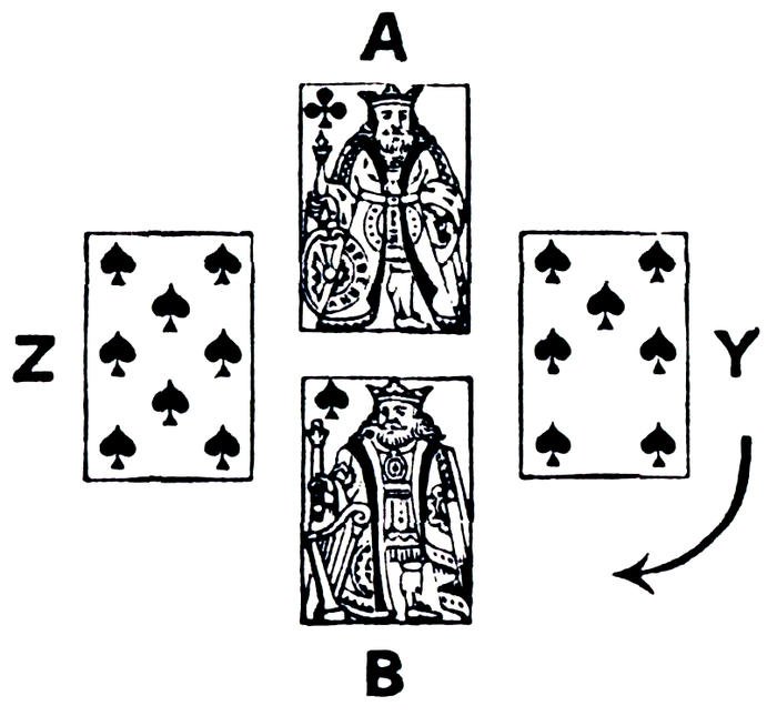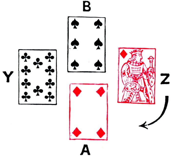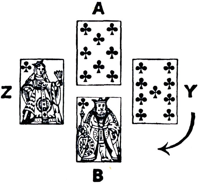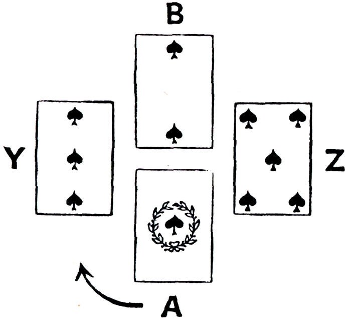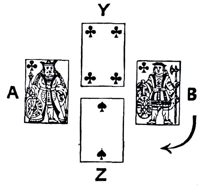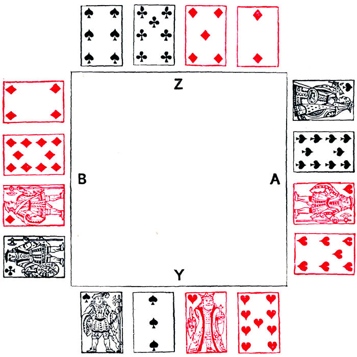 19. Three players cutting cards of equal value cut again; should the fourth (or remaining) card be the highest, the two lowest of the new cut are partners, the lower of those two the dealer; should the fourth card be the lowest, the two highest are partners, the original lowest the dealer.[5]