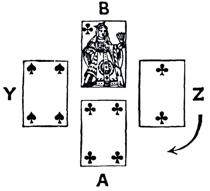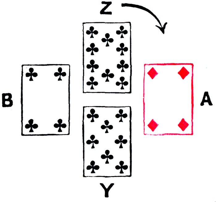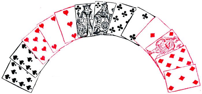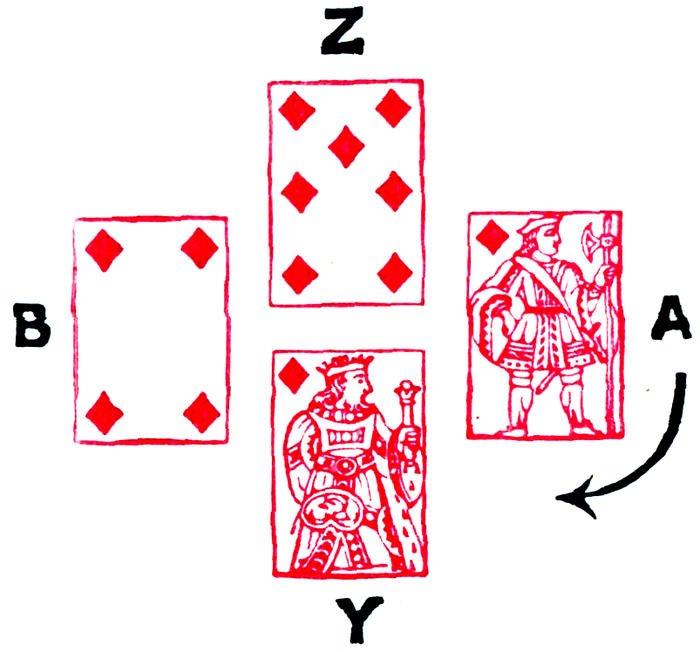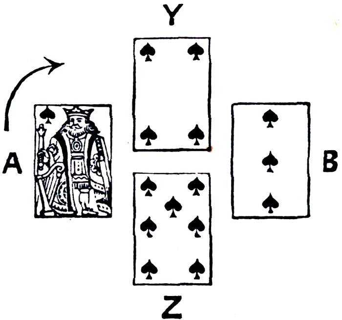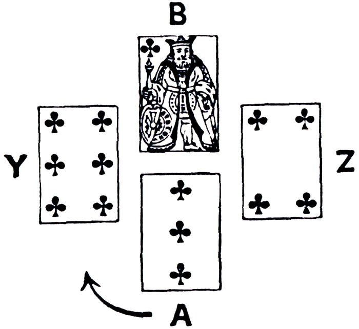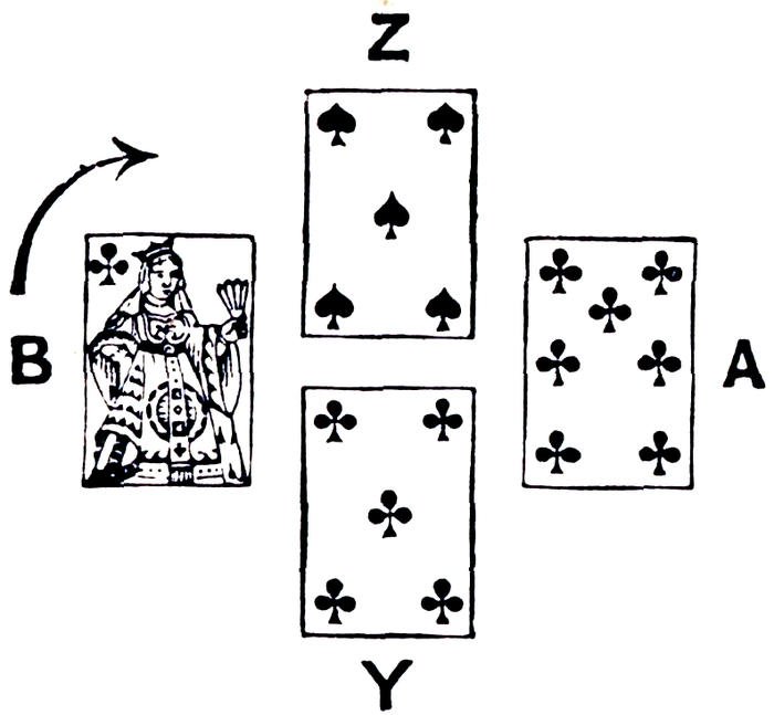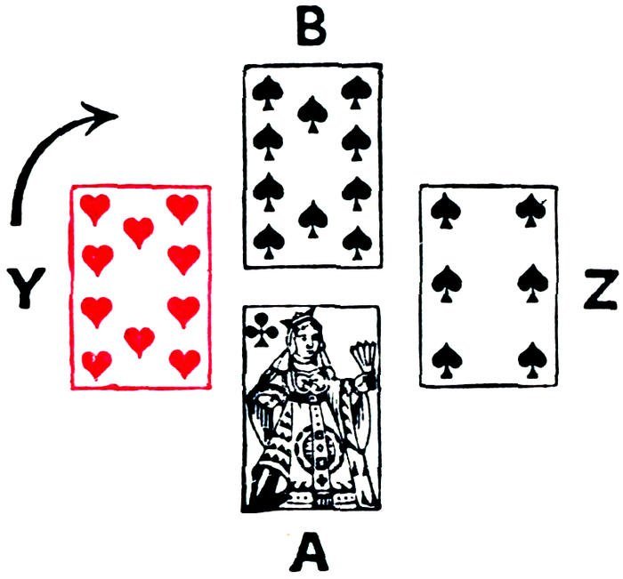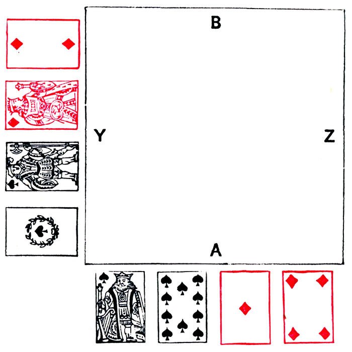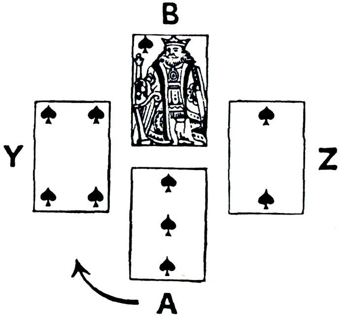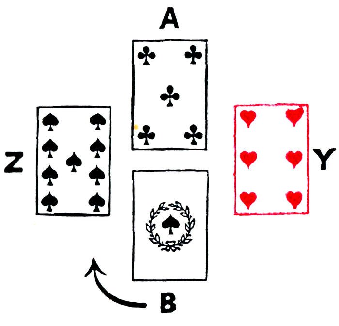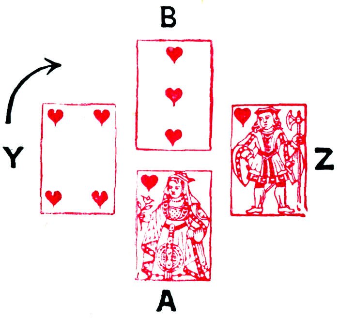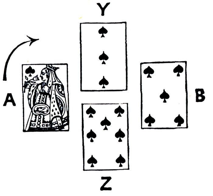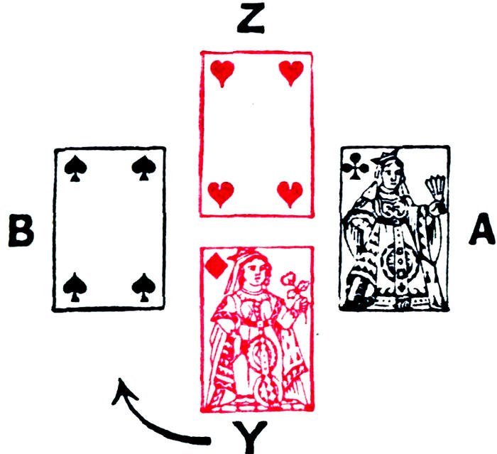 19. Three players cutting cards of equal value cut again; should the fourth (or remaining) card be the highest, the two lowest of the new cut are partners, the lower of those two the dealer; should the fourth card be the lowest, the two highest are partners, the original lowest the dealer.[5]