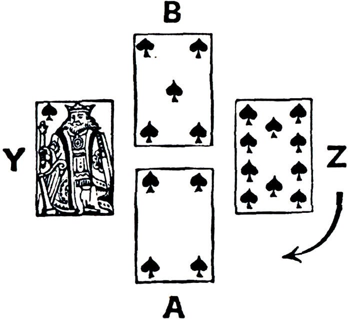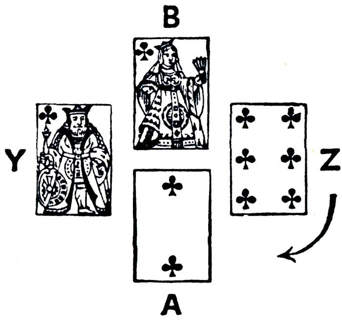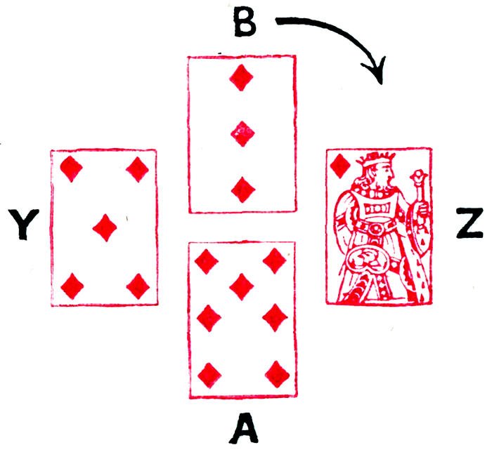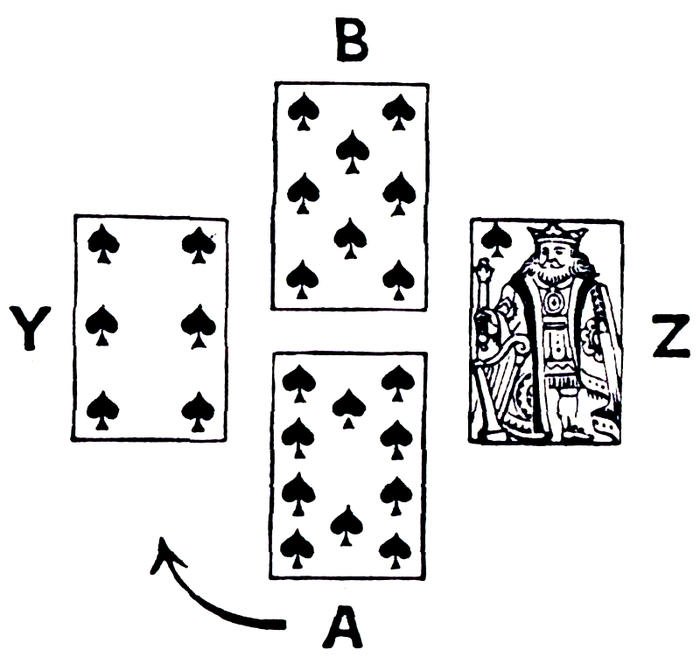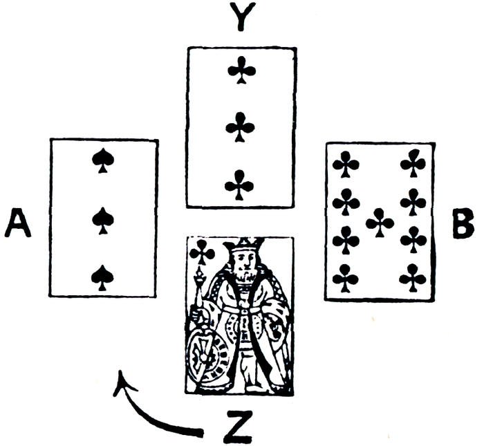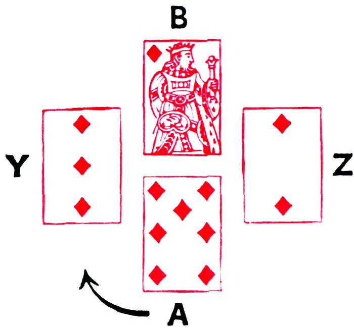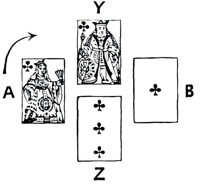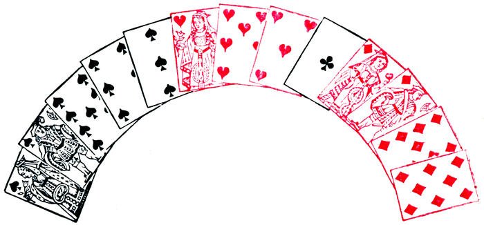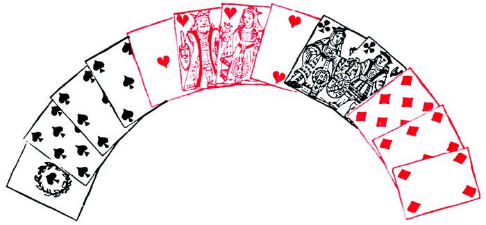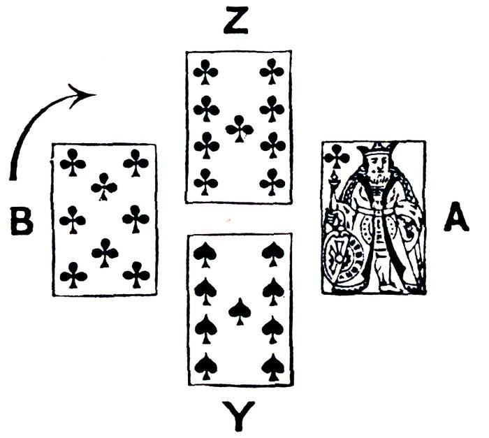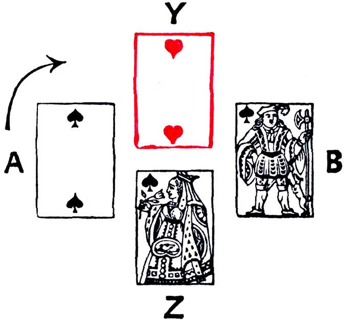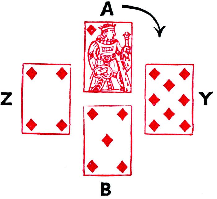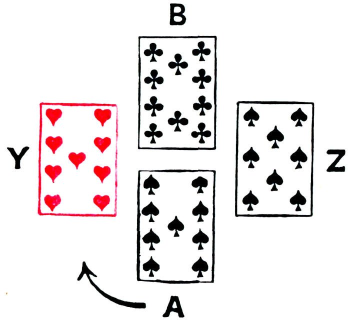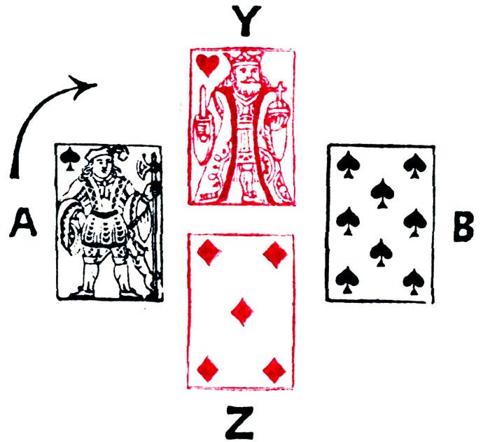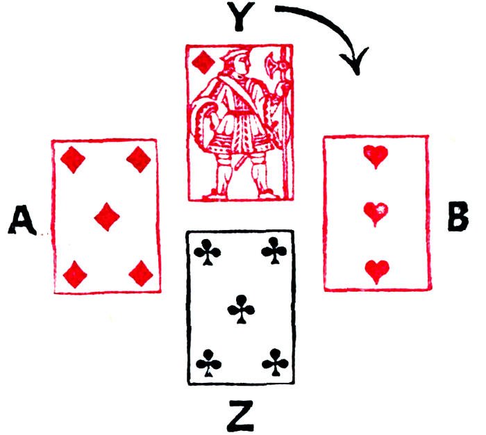 19. Three players cutting cards of equal value cut again; should the fourth (or remaining) card be the highest, the two lowest of the new cut are partners, the lower of those two the dealer; should the fourth card be the lowest, the two highest are partners, the original lowest the dealer.[5]