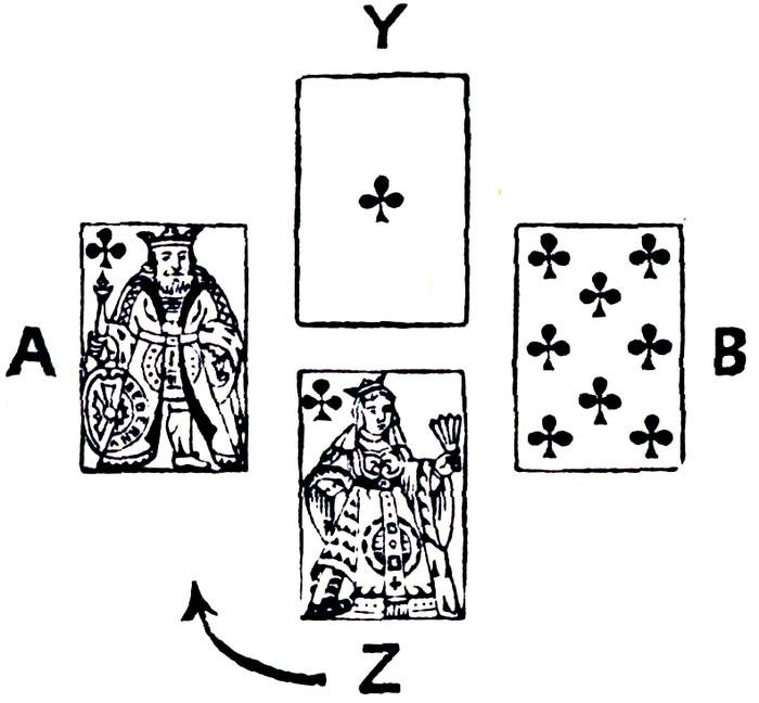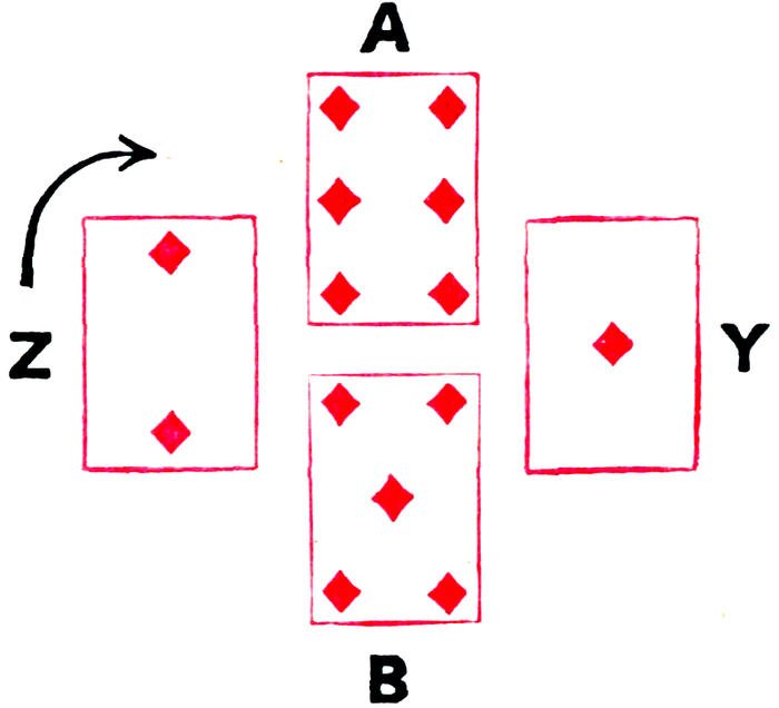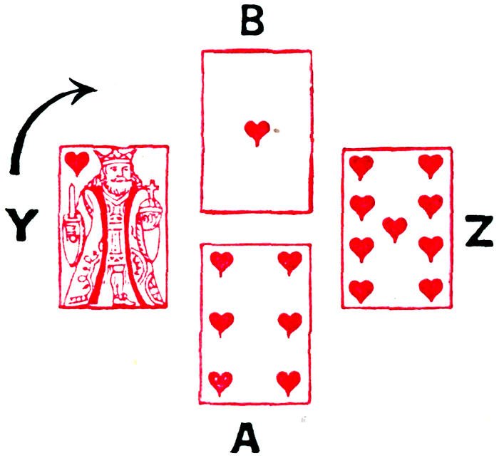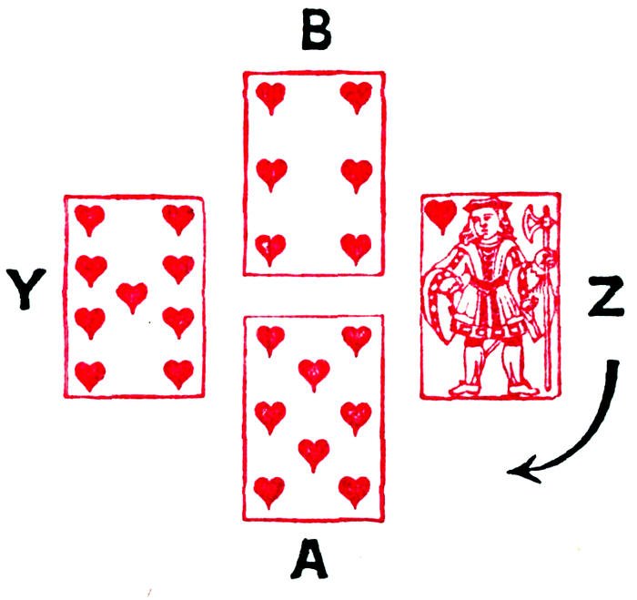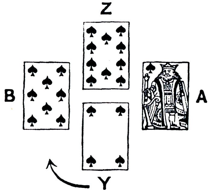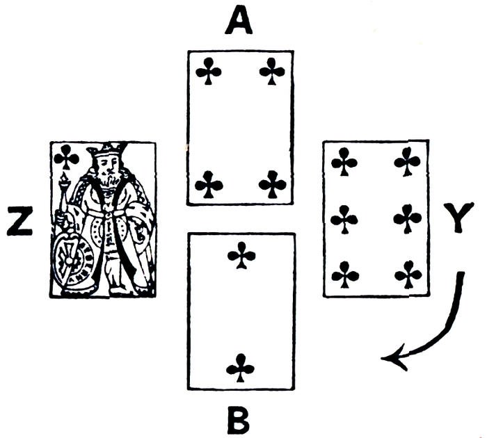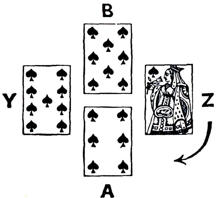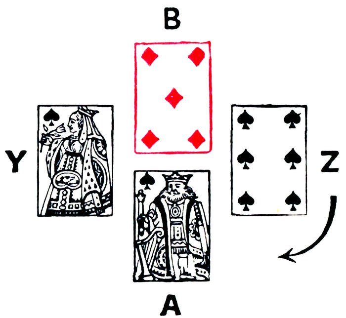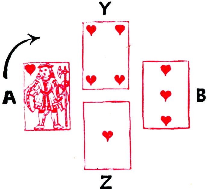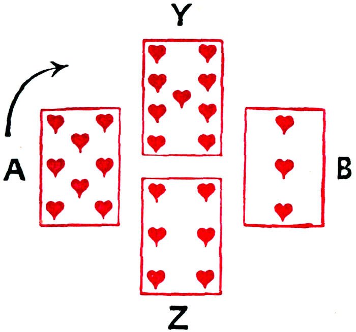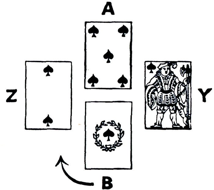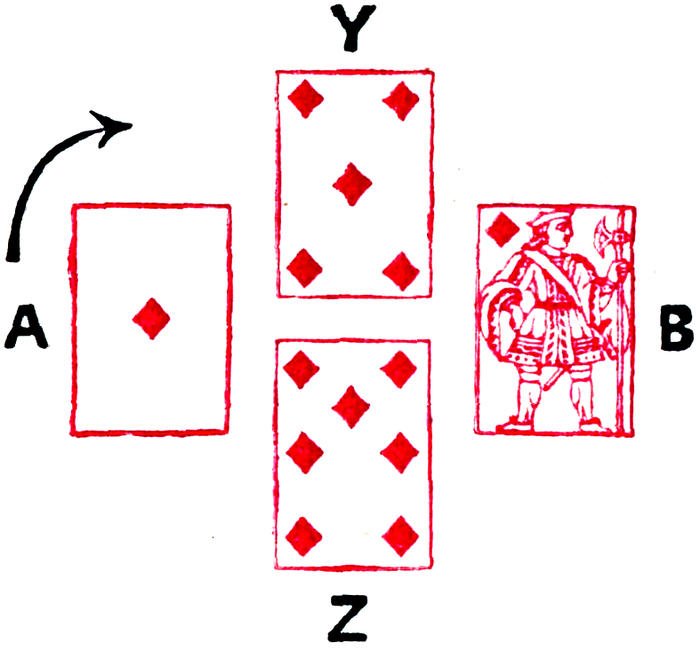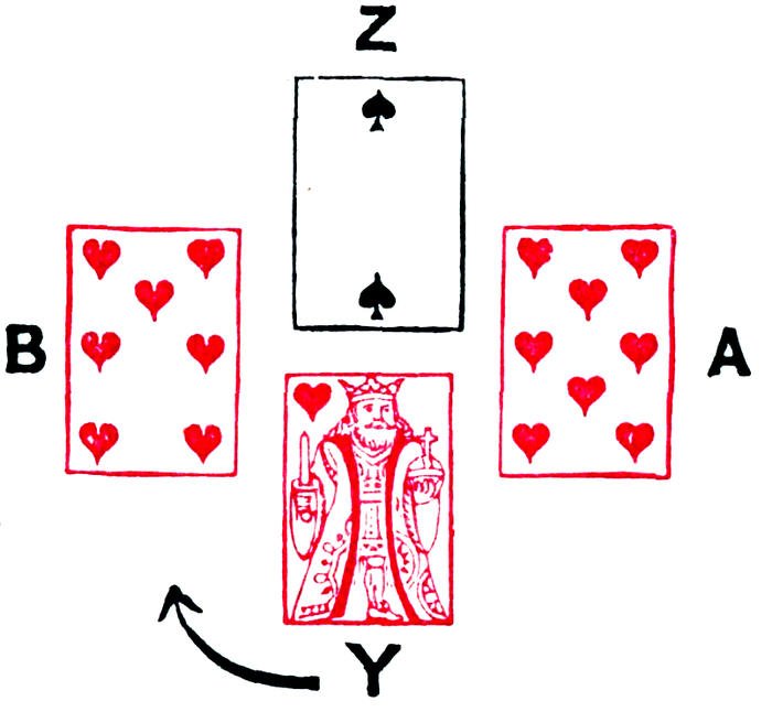 19. Three players cutting cards of equal value cut again; should the fourth (or remaining) card be the highest, the two lowest of the new cut are partners, the lower of those two the dealer; should the fourth card be the lowest, the two highest are partners, the original lowest the dealer.[5]