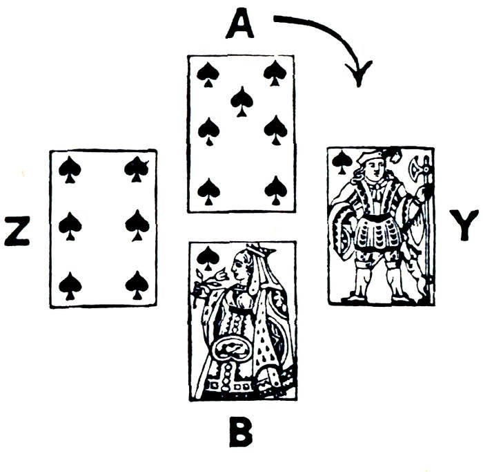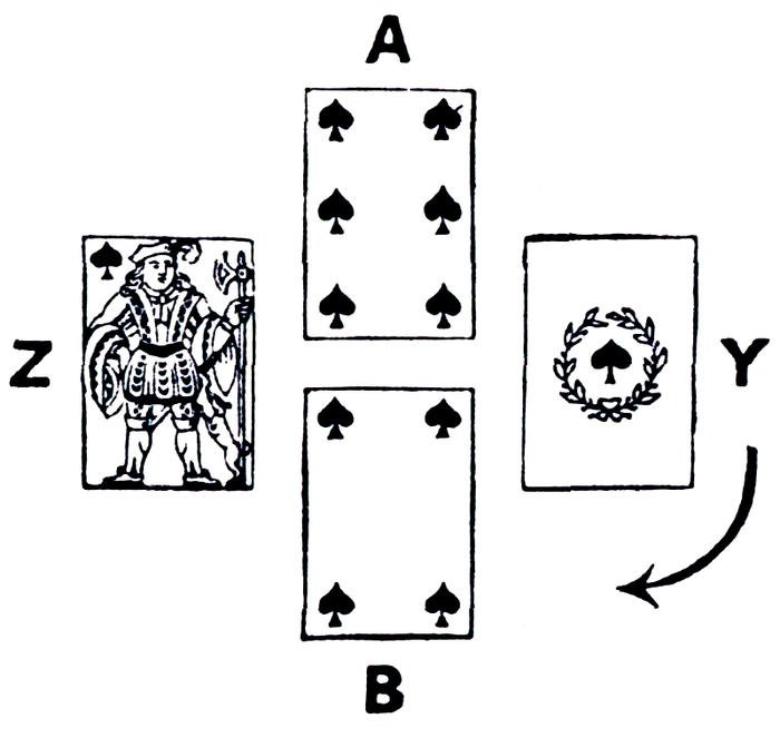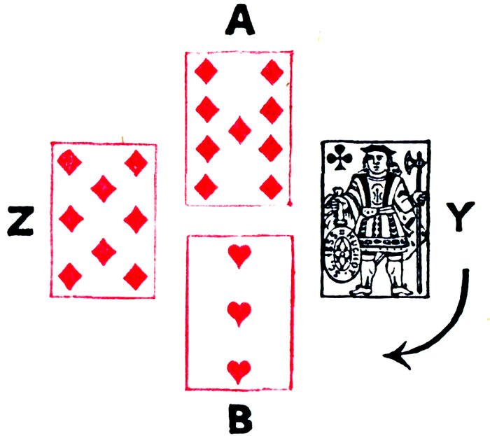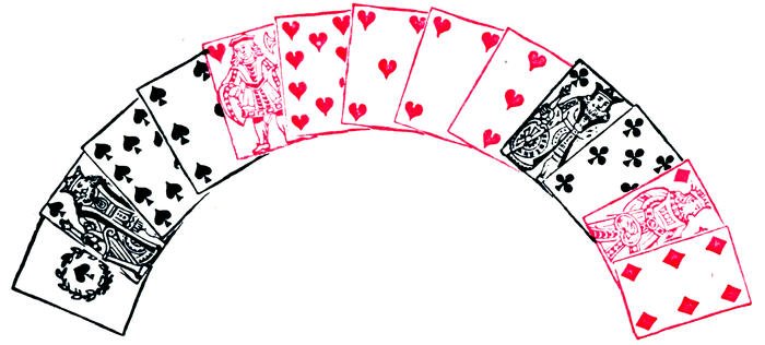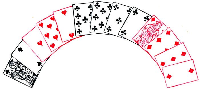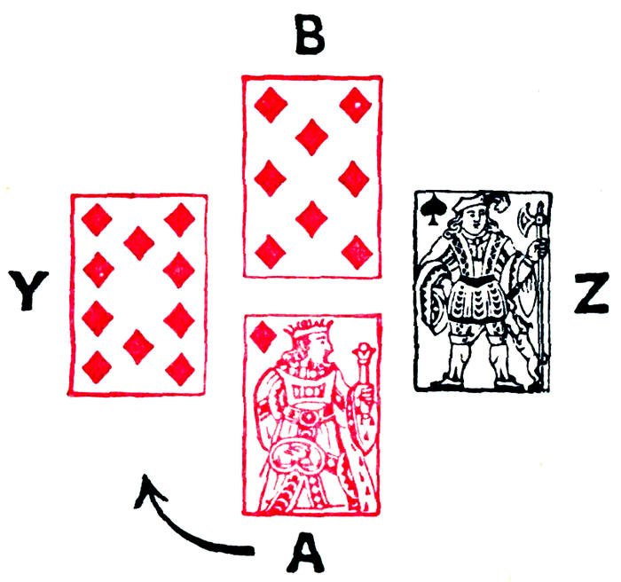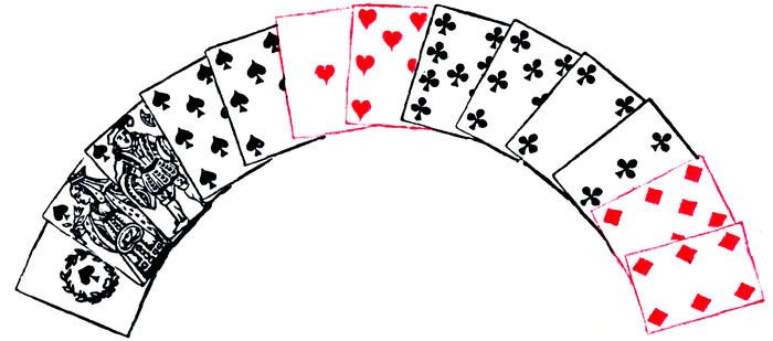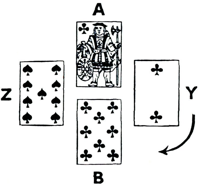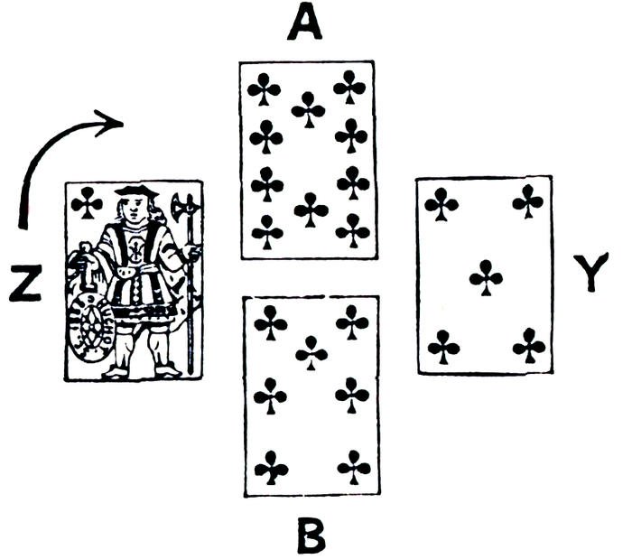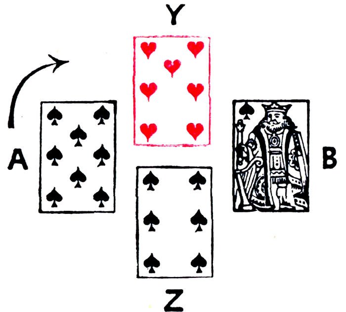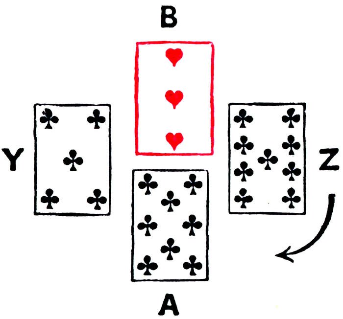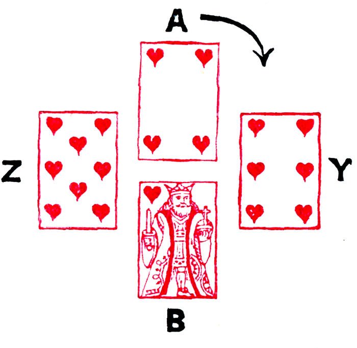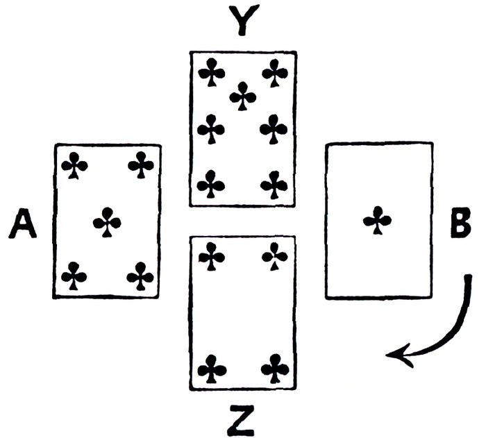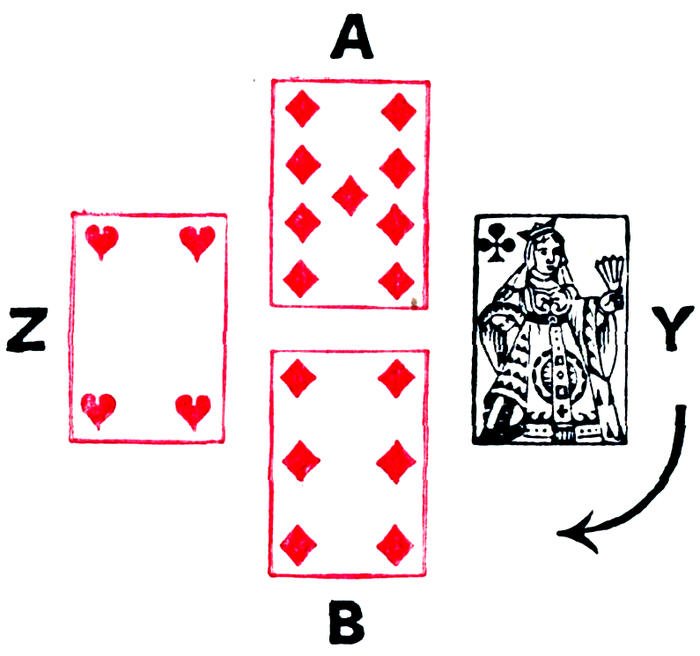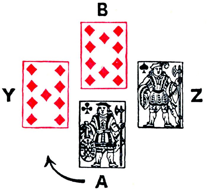 19. Three players cutting cards of equal value cut again; should the fourth (or remaining) card be the highest, the two lowest of the new cut are partners, the lower of those two the dealer; should the fourth card be the lowest, the two highest are partners, the original lowest the dealer.[5]