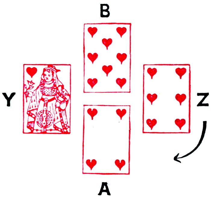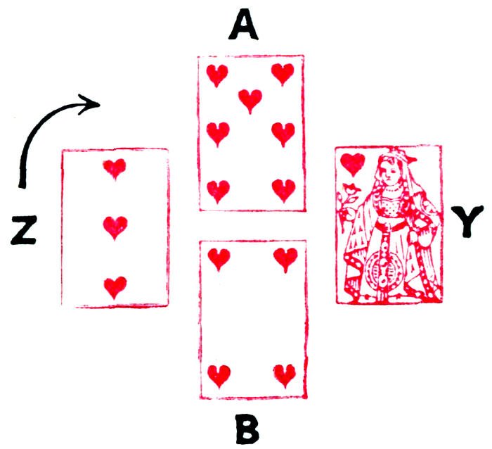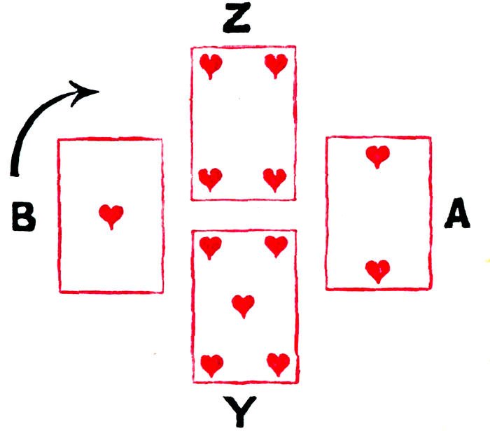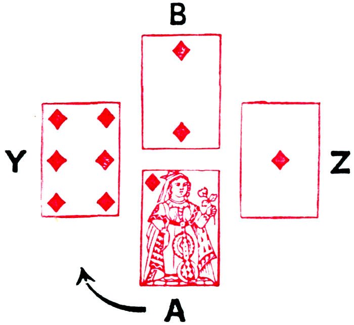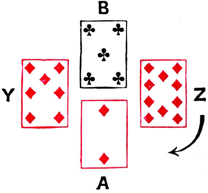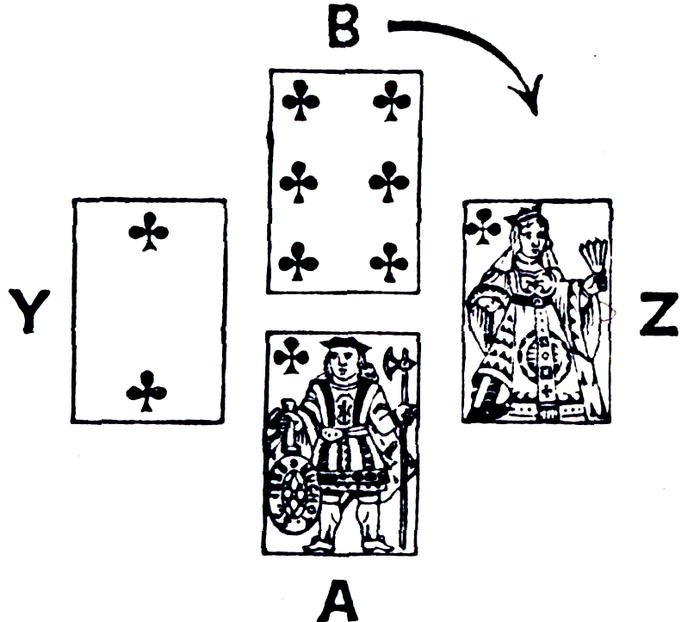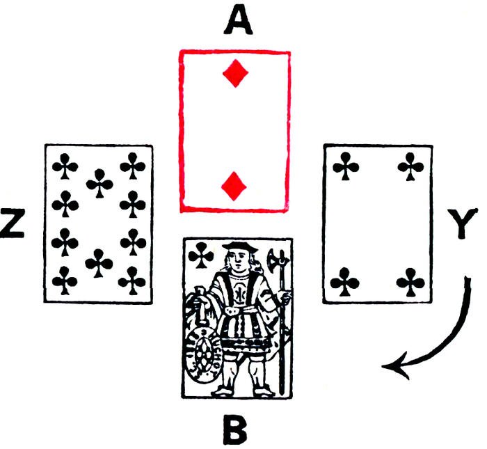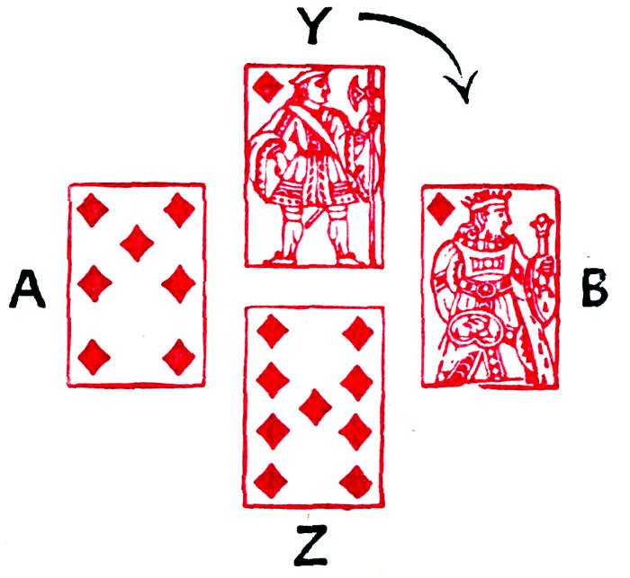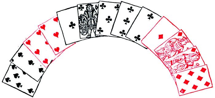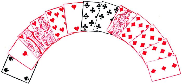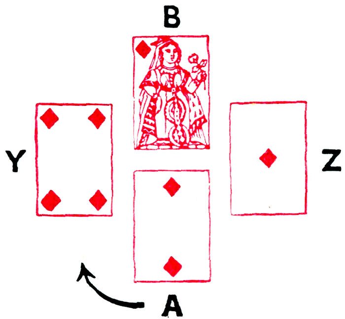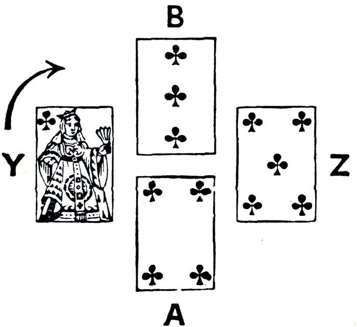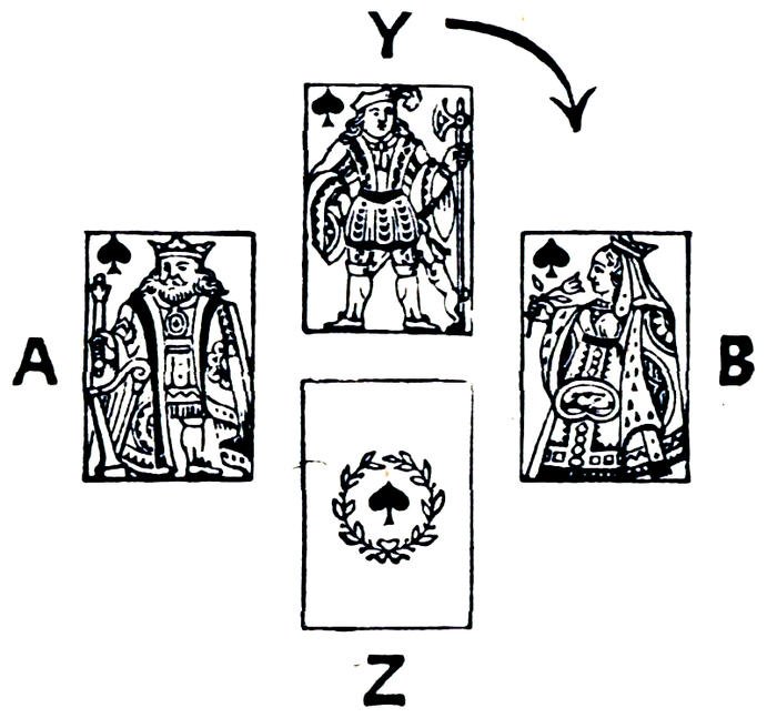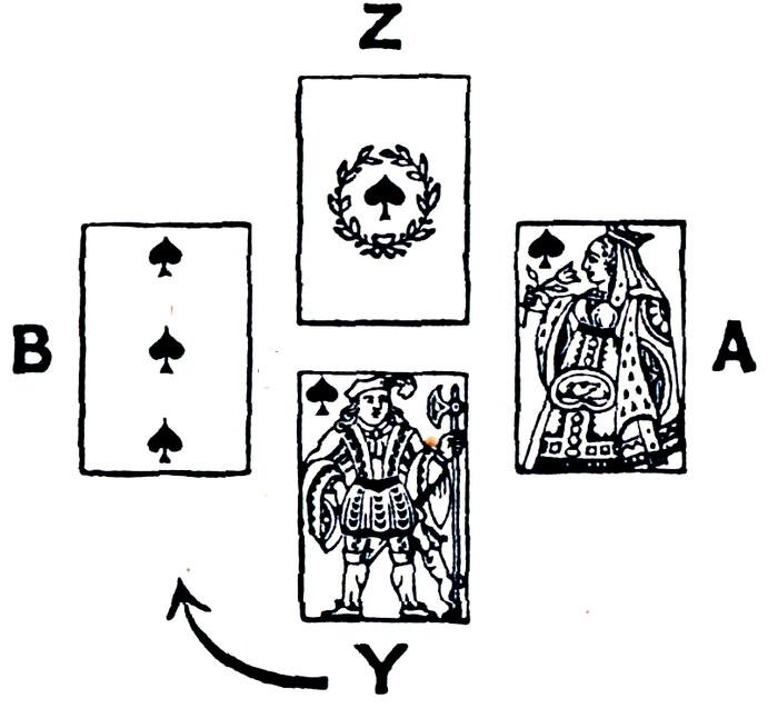 19. Three players cutting cards of equal value cut again; should the fourth (or remaining) card be the highest, the two lowest of the new cut are partners, the lower of those two the dealer; should the fourth card be the lowest, the two highest are partners, the original lowest the dealer.[5]