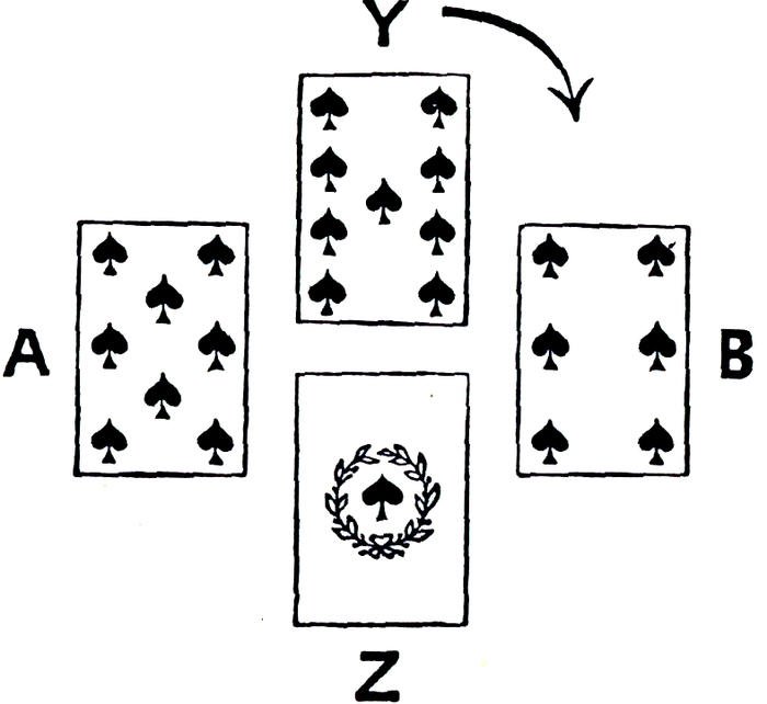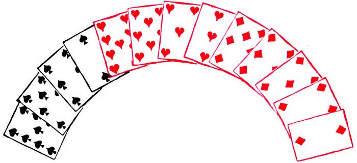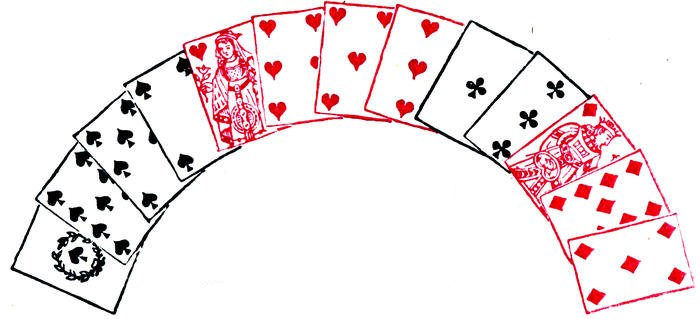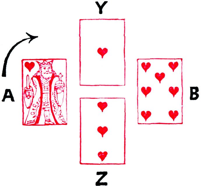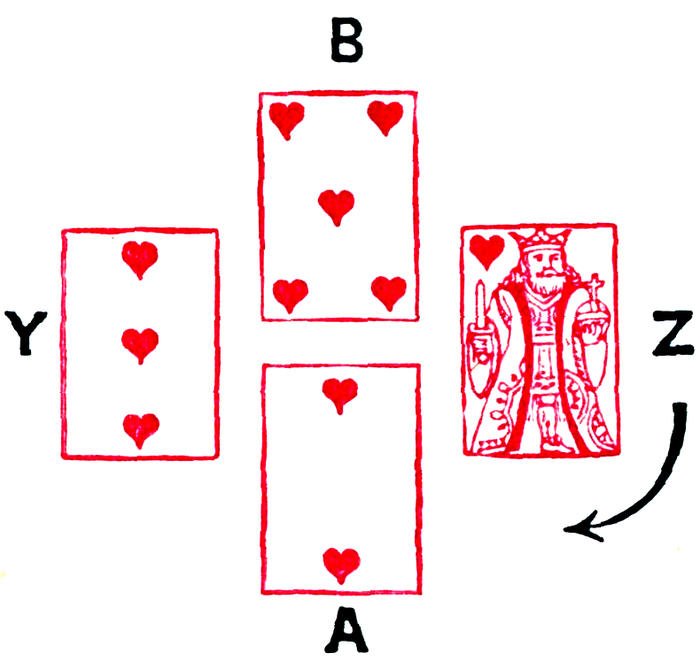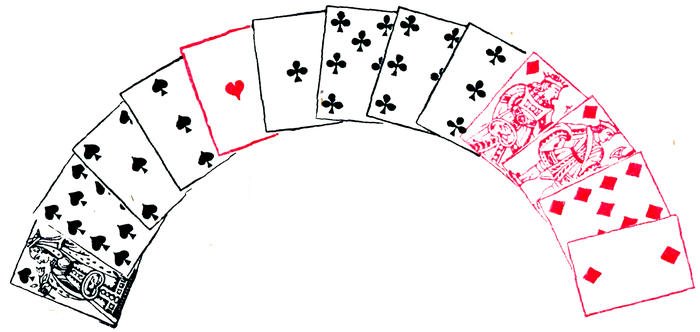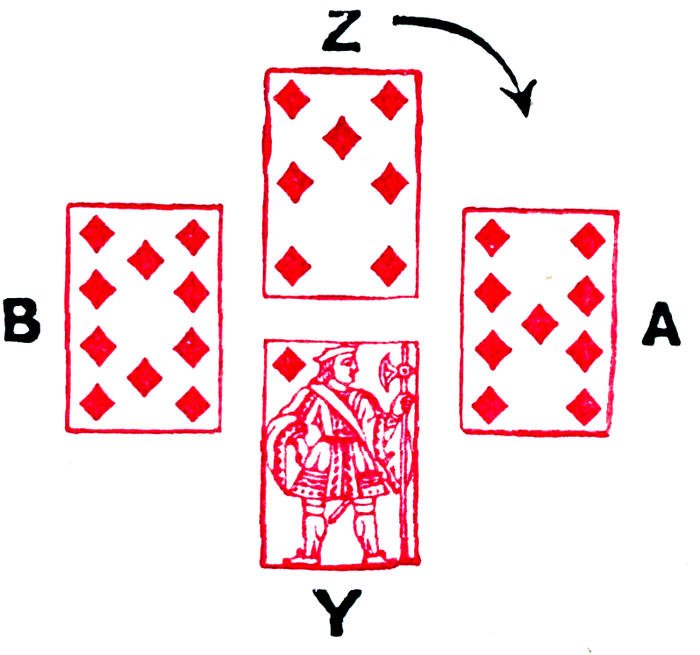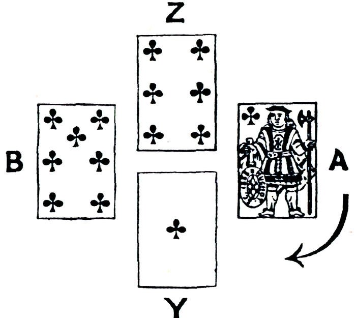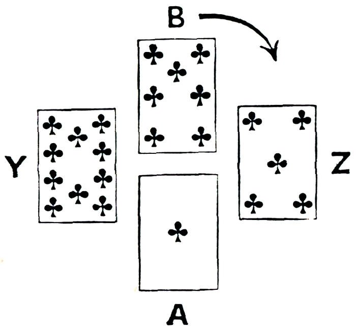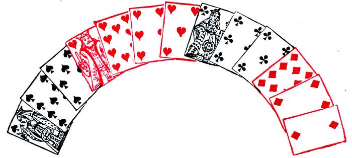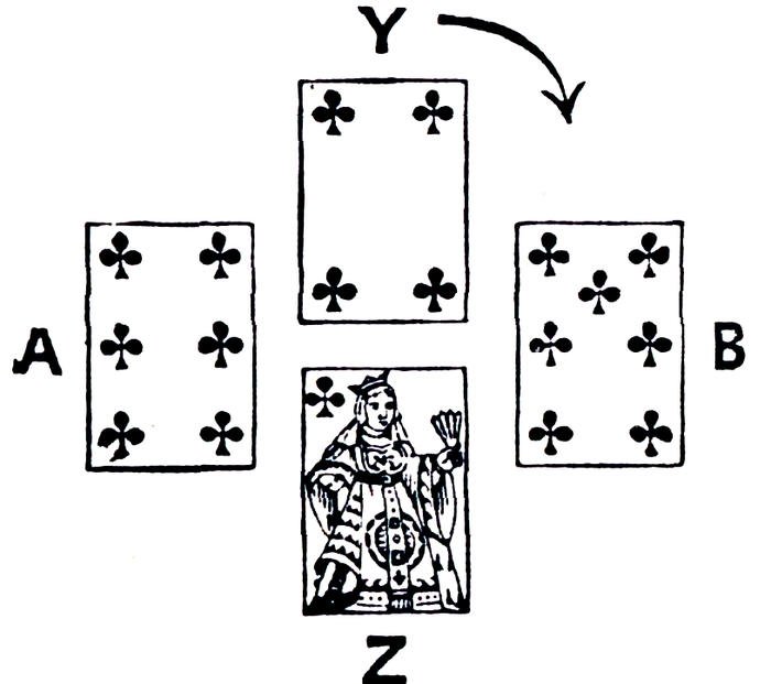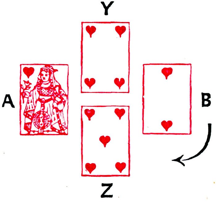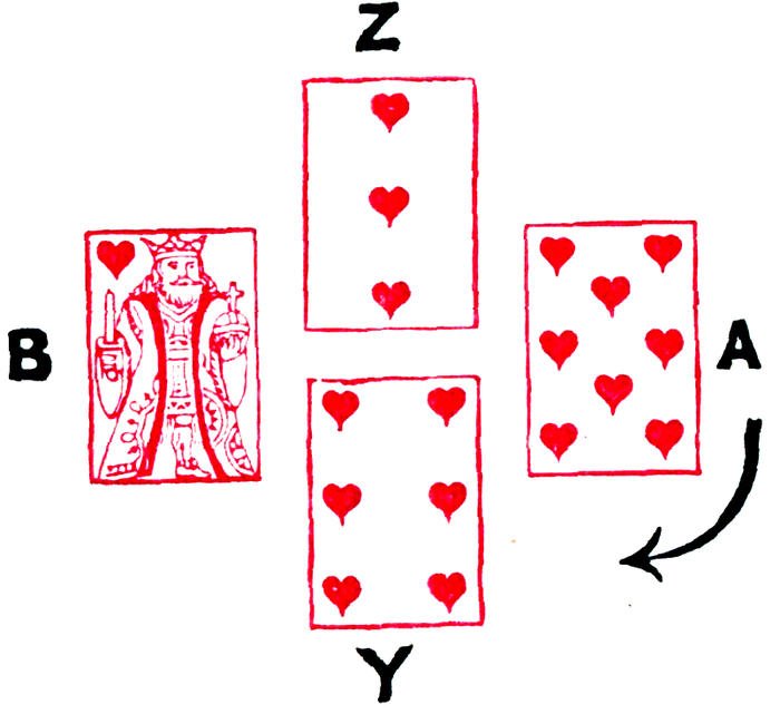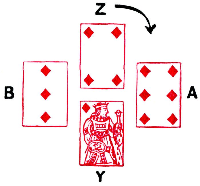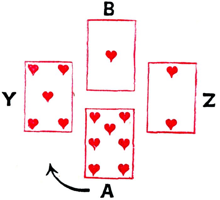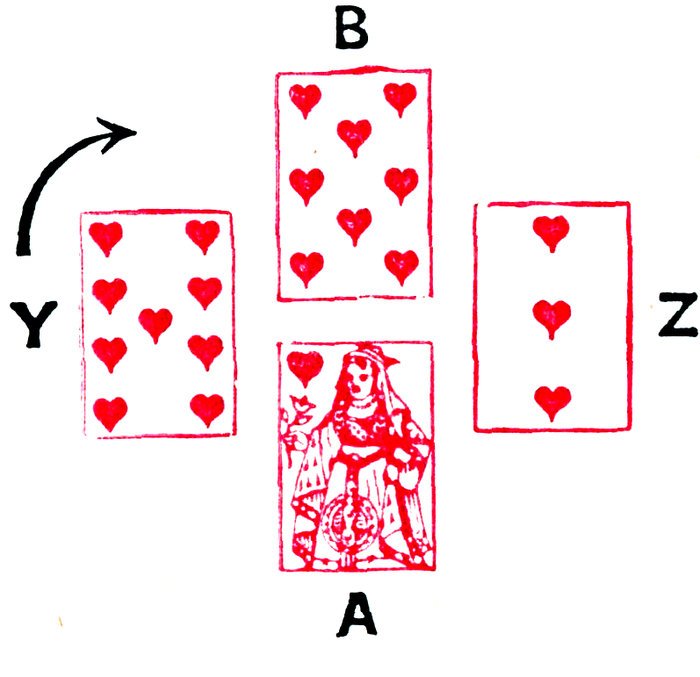 19. Three players cutting cards of equal value cut again; should the fourth (or remaining) card be the highest, the two lowest of the new cut are partners, the lower of those two the dealer; should the fourth card be the lowest, the two highest are partners, the original lowest the dealer.[5]