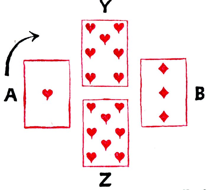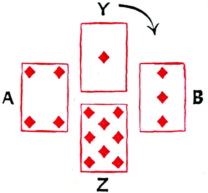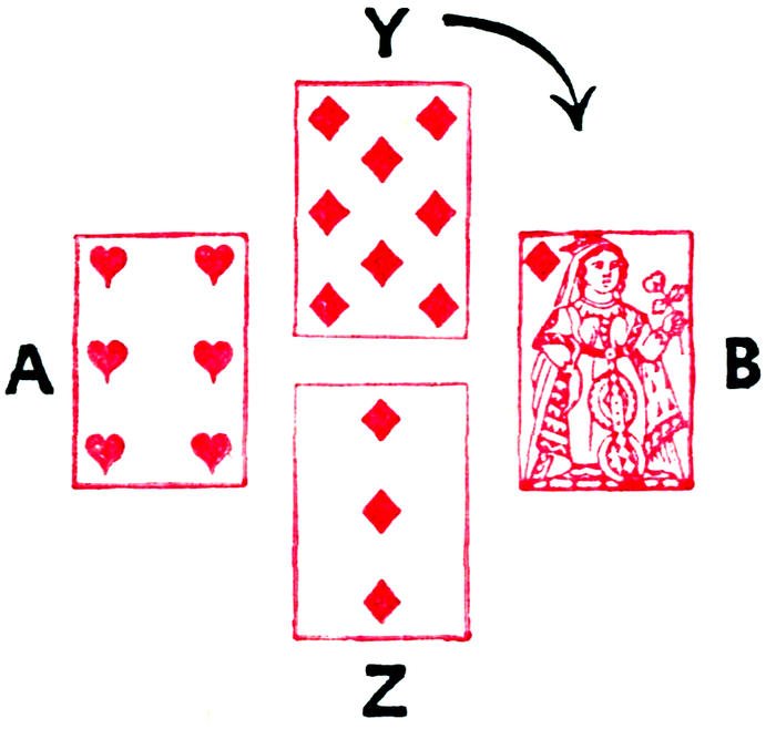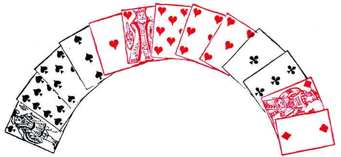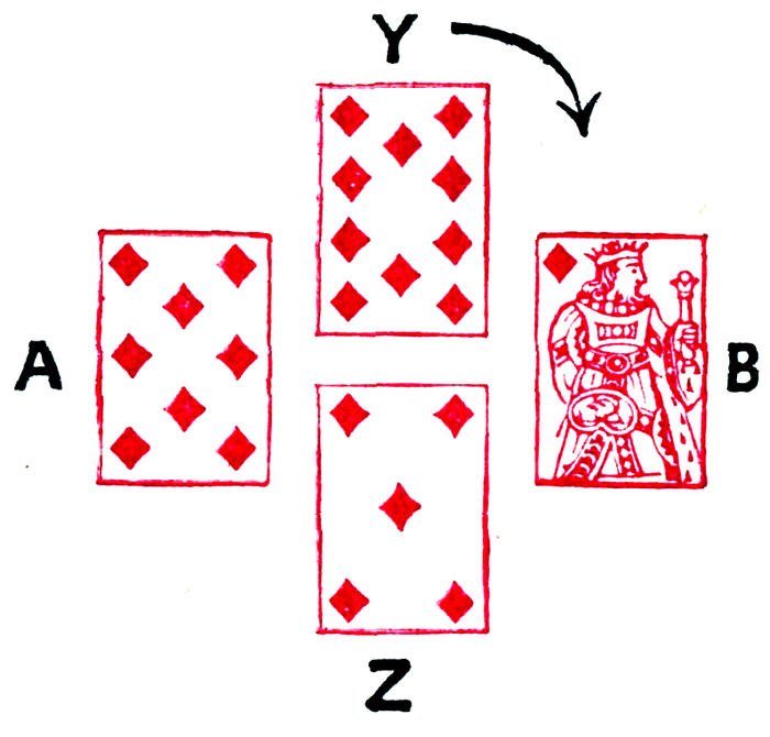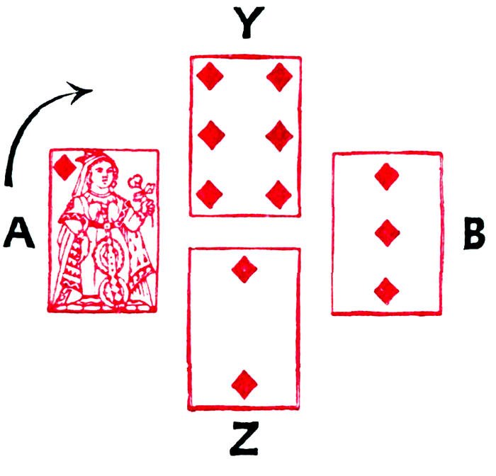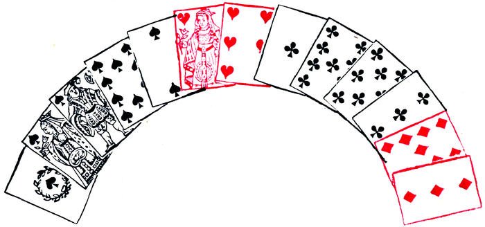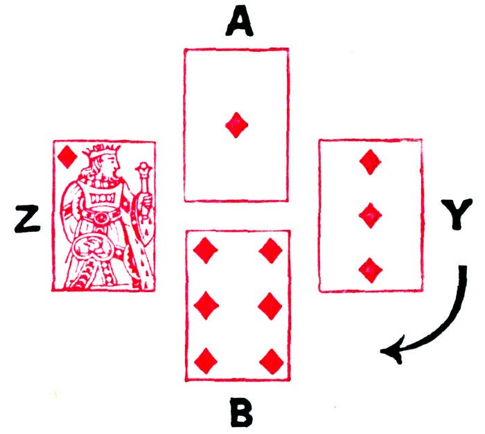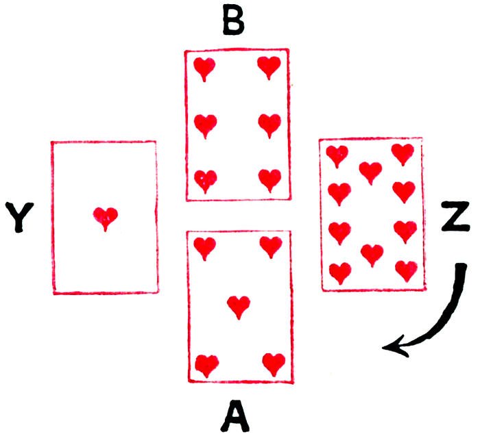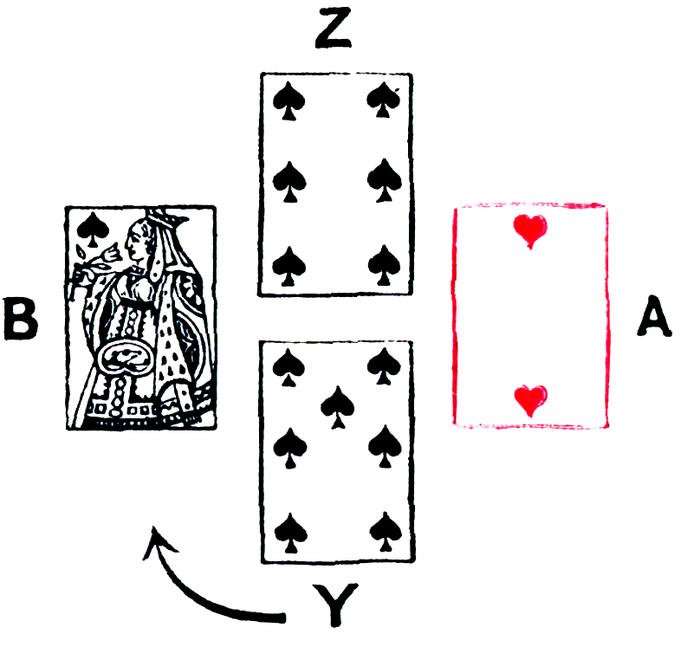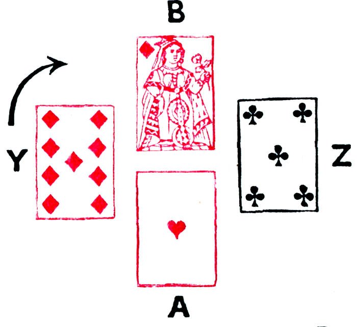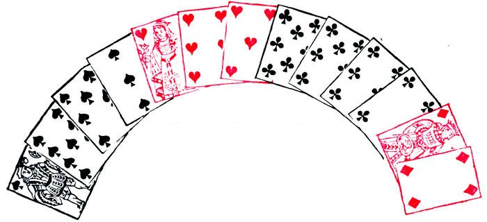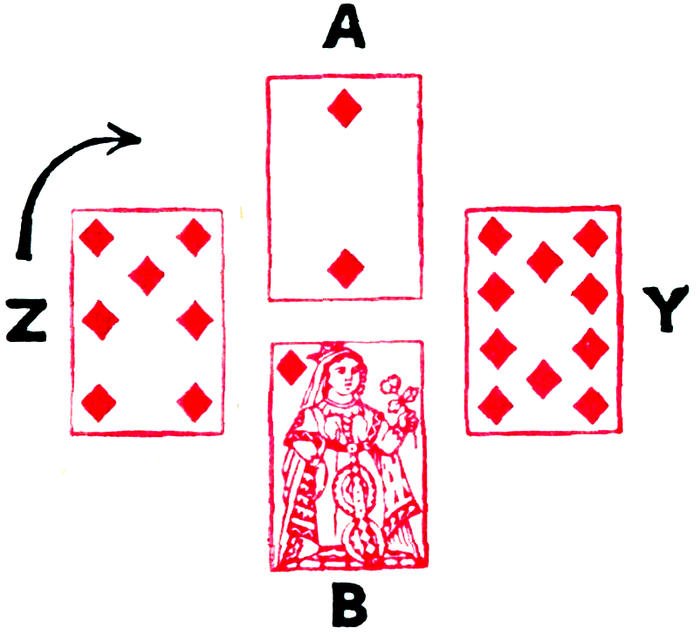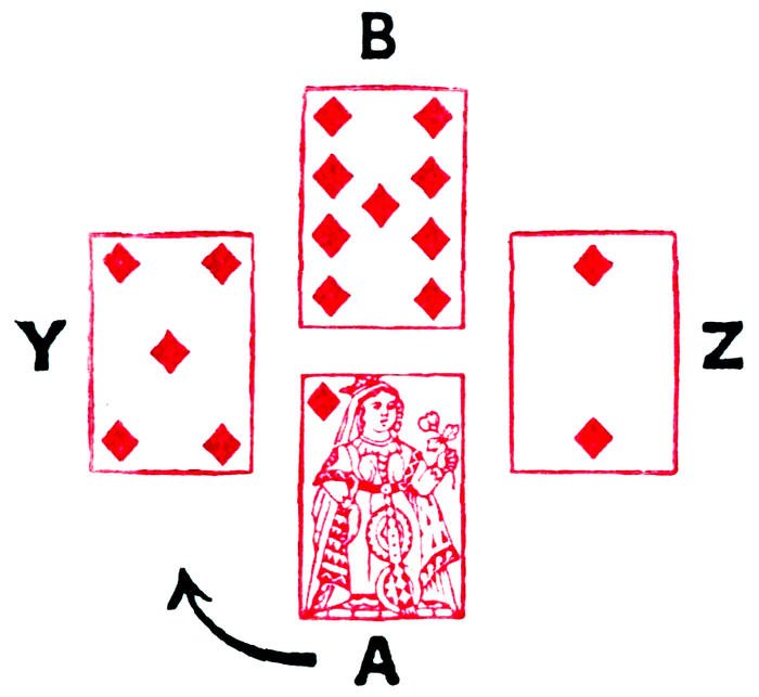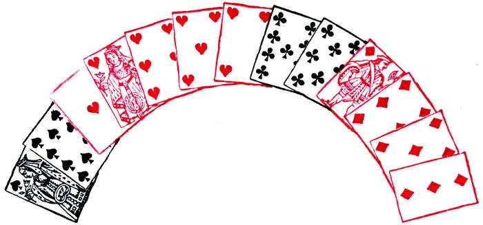 19. Three players cutting cards of equal value cut again; should the fourth (or remaining) card be the highest, the two lowest of the new cut are partners, the lower of those two the dealer; should the fourth card be the lowest, the two highest are partners, the original lowest the dealer.[5]