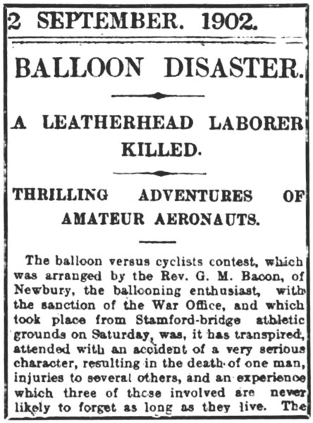The ballon versus cyclists, which was arranged by the Rev. G. M. Bacon, of Newbury, the ballooning enthusiast, with the sanction of the War Office, and which took place from Stamford-bridge athletic grounds on Saturday, was, it was transpire, attended with an accident of a very serious character, resulting in the death of one man, injuries to several others, and an experience which three of those involved are never likely to forget as long as they live. The