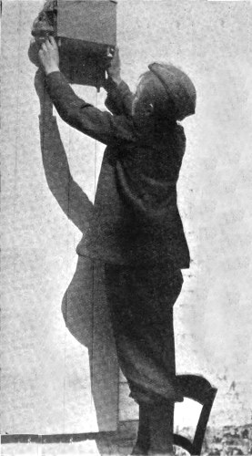 During the summer months these “concours” are held at very frequent intervals in the country districts of both France and Belgium, and a competitor is frequently the possessor of several birds, which are usually caught by means of a net, but almost every method is productive of quick results, for the chaffinch is an eager wooer, his addresses to his lady-love rendering him totally blind to his own danger. He is beset with rivals, and as the female bird invariably smiles upon the strongest suitor she is the cause of innumerable battles, in which it is usual for several lovers to be left dead upon the field. The chaffinch is very easily trapped by using a tame finch to stir up his jealousy. A limed twig is attached to the tame bird, who is allowed to run about where the twittering of the wild birds is heard. As soon as the latter become conscious of the presence of an alien in their midst an onslaught is made, which generally ends in the capture of one, if not more, of the attackers. Another method of capturing the chaffinch, and the one most in vogue among the Flemish “Vinkeniers,” is represented in two of the accompanying photographs. A stuffed finch fixed to a small peg is placed in the grass, clearly visible to the birds in the trees, while a live decoy, in a cage, carefully covered up with loose grass and twigs, so as not to attract any attention, is concealed not many yards away. A long net, spread out on the ground between the two decoy birds, lies in readiness to make prisoners of the little feathered warriors as soon as they cluster round the stuffed bird, incited by the clamours of the caged enticer. A pull of the long strings, leading into the ambush of the bird-catchers, may cause as many as thirty finches at a time to fall into the hands of the trappers. 509