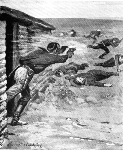 Within the ranch-house all was quiet. The twenty men selected for the dash stood with their right hands clenched around the butts of their heavy Colts and their lefts grasping kerosene-soaked torches. All eyes were fixed on their leader, who stood next to big Ben Williams, who was noiselessly removing the bars from the door. “Ready, boys!” came in clear, low tones from Benton as the last bar was lifted from its socket. Every man braced himself for the leap—ready, in fact, anxious, to have the dreadful suspense at an end, though each well knew that the opening of the door would be a signal for five hundred rifles to sweep the space between the house and the fort with a perfect hail of lead. Quickly the door swung open, and Benton leaped out. His eyes swept the surrounding hills; then he turned and tried to leap back into the protection of the log walls again. But all in vain! Quicker than thought came a flash of fire from a loophole in the fort, and Benton fell in the doorway with a bullet from Tom Champion’s rifle through his lungs.