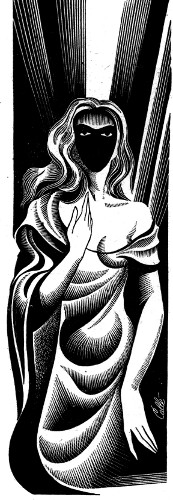 She stood in the bedroom doorway. I think she was trembling. She was wearing a gray fur coat, white-speckled, and a gray velvet evening mask with shirred gray lace around the eyes and mouth. Her fingernails twinkled like silver.