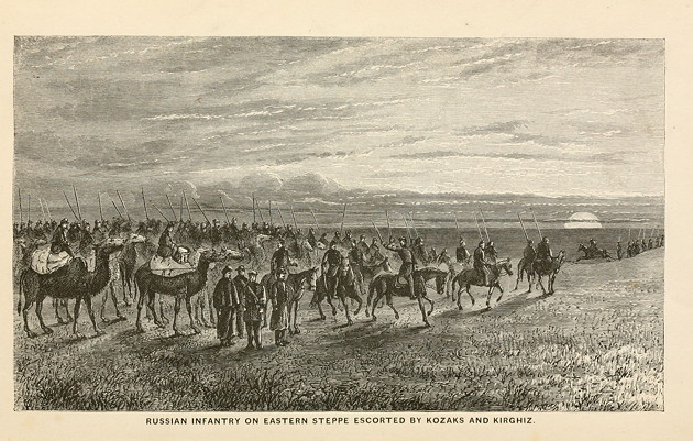 RUSSIAN INFANTRY ON EASTERN STEPPE ESCORTED BY KOZAKS AND KIRGHIZ.