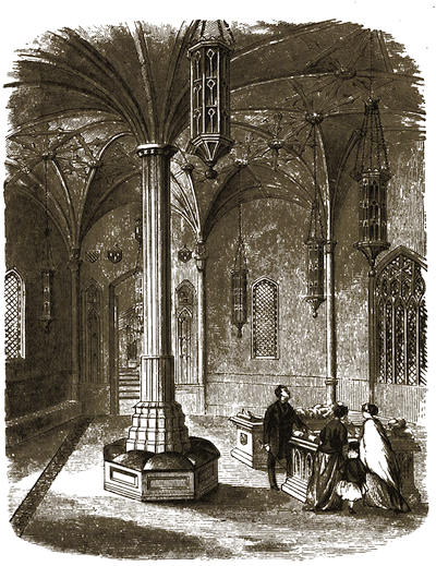 [2] “Alton Towers and Dove-Dale.” By Llewellynn Jewitt, F.S.A. (Black and Co.) The Roman Catholic establishment just referred to is close to the pretty little town of Alton, in which the visitor will find an excellent and comfortable inn (the “White Hart”). The intention of the founder, and of the architect, Pugin, in the establishment of the picturesque pile of buildings referred to, was to found an institution, lecture-hall, schools, &c., for the town of Alton; a large cloistered establishment for nuns, a chapel, and a hospital for decayed priests. The chapel alone is finished, and in it service is regularly performed by a resident priest, who lives in one part of the monastic buildings. The schools, too, are in use, and the building erected as a residence for the master is used as a small nunnery. In the chapel, which is elegantly fitted up, are buried John, Earl of Shrewsbury, the founder of the hospital, who died in 1852; his Countess (Maria Theresa), who died in 1856, to each of whom are splendid monumenta