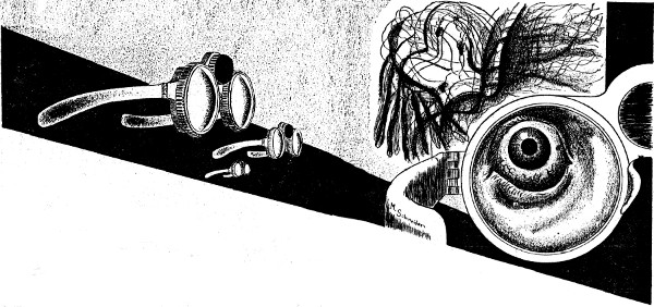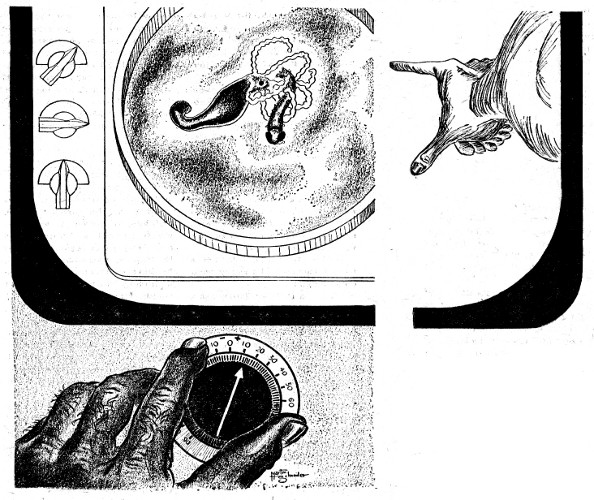 There was a closeup of the alien's face watching the switch, and the Times noted that his ears were symmetrically half-circles, almost perfect with no earholes visible. The voice of the uniformed one answered, a brief word in a preoccupied deep voice. His back was still turned. The other glanced at the switch, moving closer to it, talking casually, the switch coming closer and closer stereoscopically. It was in reach, filling the screen. His hand came into view, darting out, closed over the switch—