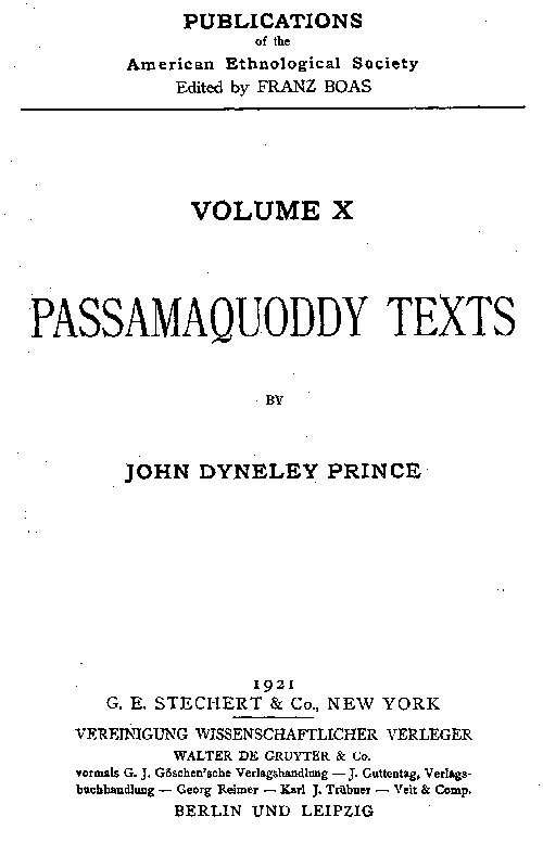 Of the texts in the present work only the Wampum Records (former publication cited above) and part of Series 4, "Songs" (N. Y. Academy of Sciences, XI, No. 15, pp. 369-377 and XIII, No. 4, pp. 381-386) have been published before in an imperfect form. Poetical and inexact English renderings of some of the Kuloskap material (Series 2 below) have appeared in Leland and Prince "Kuloskap the Master," New York, 1902, a popular exposition of eastern Algonquin folk-lore.