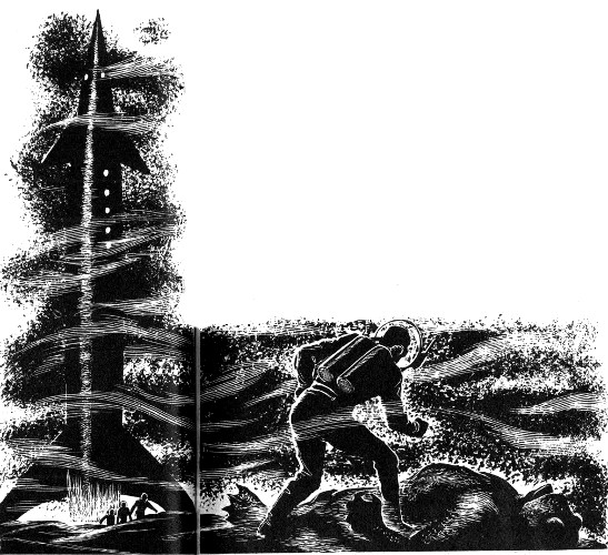 A few seconds later, he was dressed in windsuit and oxygen helmet. A can of vita-rations was strapped to his back and his compass was in his hand.