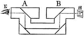 This telescope consists of a series of square wooden tubes, with an inside diameter of about five inches, so carefully joined together that no ray of light can find its way in through the crevices. The oblique lines are pieces of looking-glass, with their faces turned toward each other. Now, by placing the eye at E, of course it would seem that anything at H could be seen directly through the tubes A B, while if a book or other opaque object be interposed, as shown in Fig. 2, it would seem equally a matter of course that the view would be obstructed; this, however, is not the case, as the mirrors reflect the object through the tube and it appears as plainly as when the book is removed.