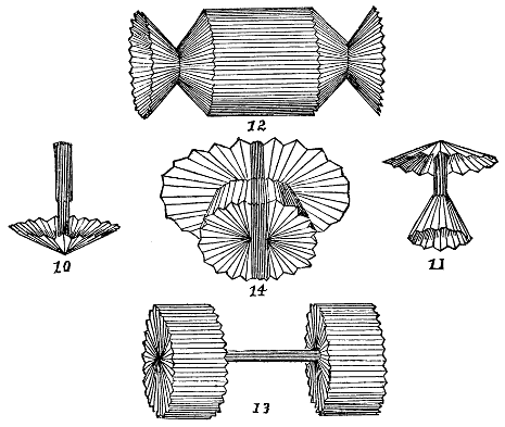 The Chinese lantern (Fig. 12) is as easily made. Open out all the paper, and twist it around; catch it now by the central part, and by compressing the central folds well together, these wheels are produced (Fig. 13).