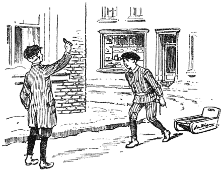 Een kleine, armelijk gekleede jongen bracht juist een wrak Sunlight-zeep-kistje op de baan, waar een bleek kereltje van een jaar of vier in zat.
