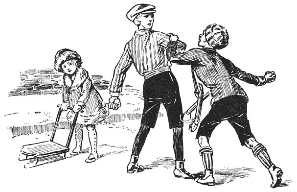 „Hier,” zei de scheidsrechter, „hier is je slee en ik moest je nog wel bedanken van die kleine jongens. Ze zijn met hun eigen equipage weggegaan, terwijl jij aan ’t bakkeleien was,” en hij lachte om zijn aardigheid.